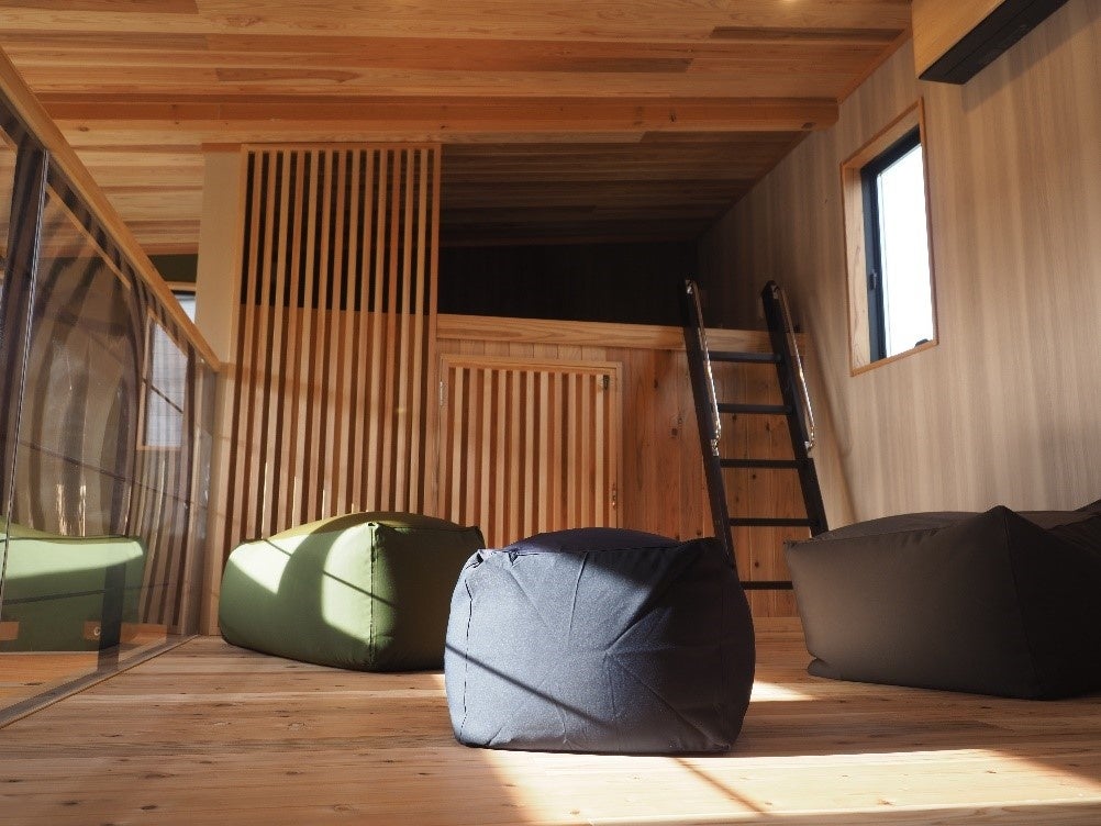 階段を上がった2階はよりウッディな空間が広がり、そこには座るだけでぼーっとしてしまうようなリラックスクッションが配置されています。