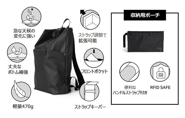 折りたたんで専用ポーチに収納できるのが最大のポイント!専用ポーチはRFID SAFE生地使用!バックパック使用時は収納ポーチが貴重品ポーチにもなる!