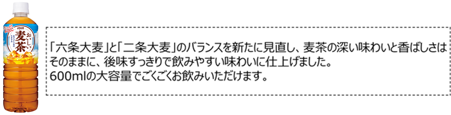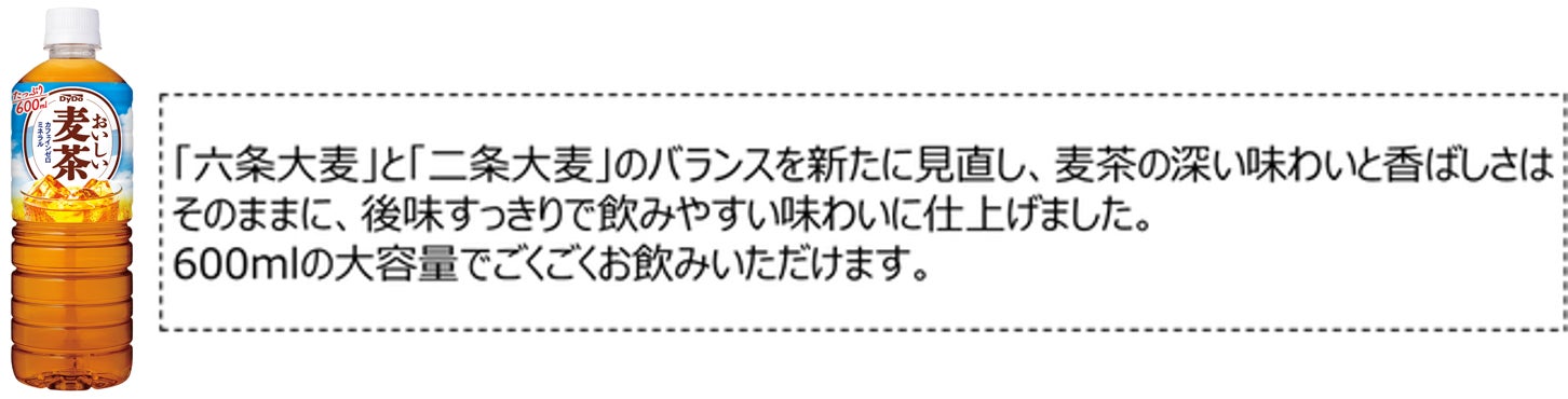 二種類の麦の組合せで麦本来の深い味わいと香ばしさを追求!後味すっきり、ごくごく楽しめる 「おいしい麦茶」を新発売