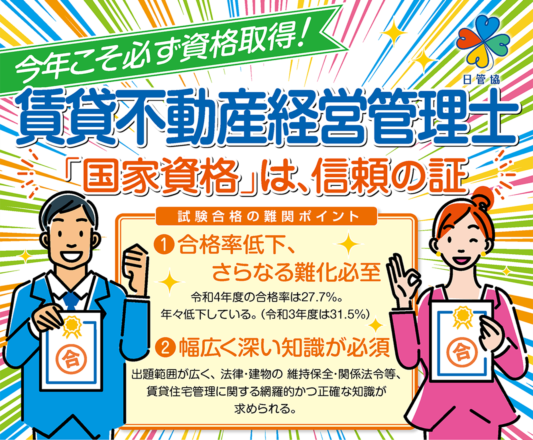 公益財団法人日本賃貸住宅管理協会(本部:東京都千代田区、会長:塩見紀昭、以下:日管協)は、令和5年度賃貸不動産経営管理士試験(国土交通大臣登録証明事業)に向けた「賃貸不動産経営管理士5問免除講習」(以下:5問免除講習)の受講申込みを4月27日(木)より開始します。