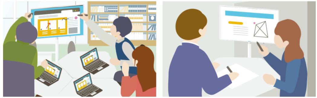 32インチモバイルディスプレイMOMOBoとは、1人1台端末と大型提示装置のちょうど間のサイズ感を持つ多機能ディスプレイです。複数人で行う協働学習やグループディスカッションで活躍します。また、本体にキャリー&バッテリー搭載で学びの環境に合わせて好きなタイミングで移動が可能です。