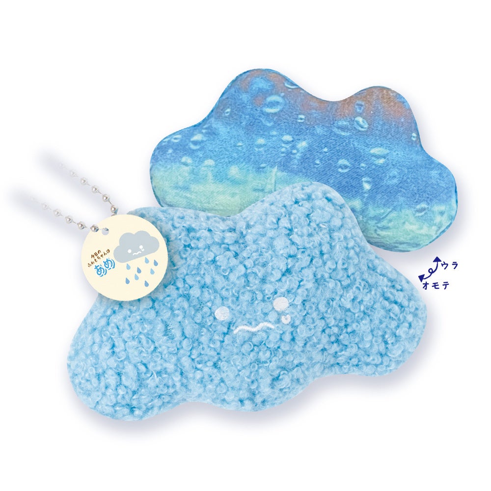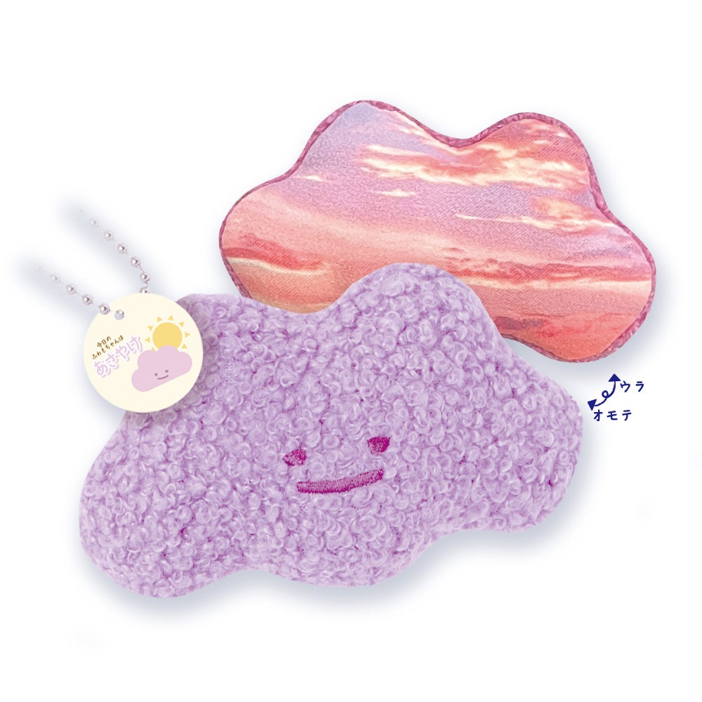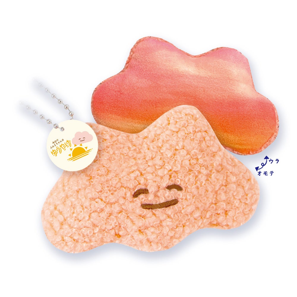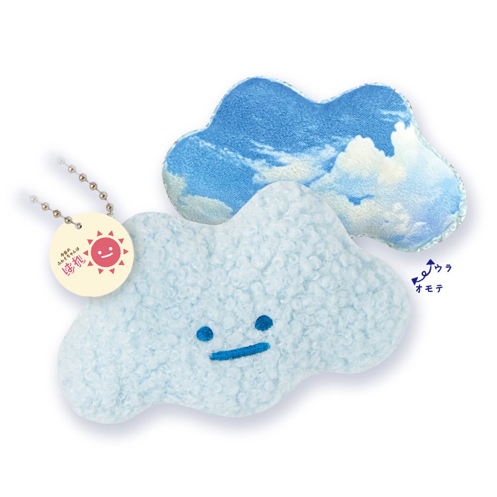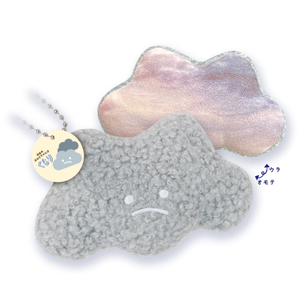 ふわもこの手触りボディに、ほんわかした愛らしい表情を刺繍で表現しています。デザインは<はれ><くもり><ゆうやけ><ゆき><あさやけ><あめ>の6種類。裏面はお天気によって異なる空の景色のプリント入りです。