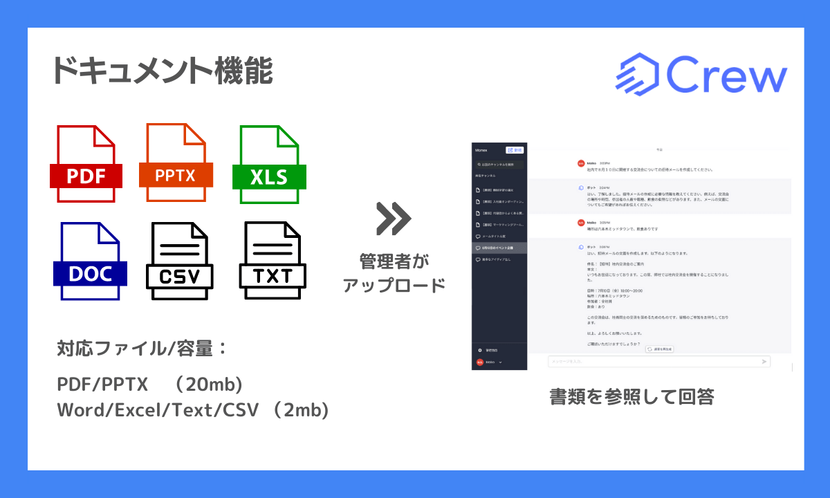 自治体や金融機関では、日頃から社内文書を活用した職務が存在します。社内文書は時に膨大になり、職員が時間をかけて該当箇所を検索して参照していました。不慣れな職員ですと、検索に時間がかかります。そこで、Crewで簡単に必要箇所を要約して回答してくれる書類アップロード機能を開発しました。