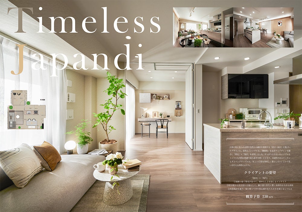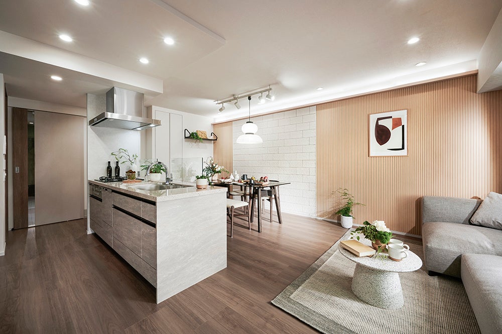 本作品は、中央日本土地建物株式会社が事業主となるマンション「バウス府中(住戸数全78戸)」のマンションギャラリー内のモデルルームコーディネートです。クライアントからは、府中という立地の歴史が感じられながらも働き盛りの世代に響く効率的な暮らしを実現できる住まいを、というご要望をいただき、歴史×現代をテーマに構築いたしました。