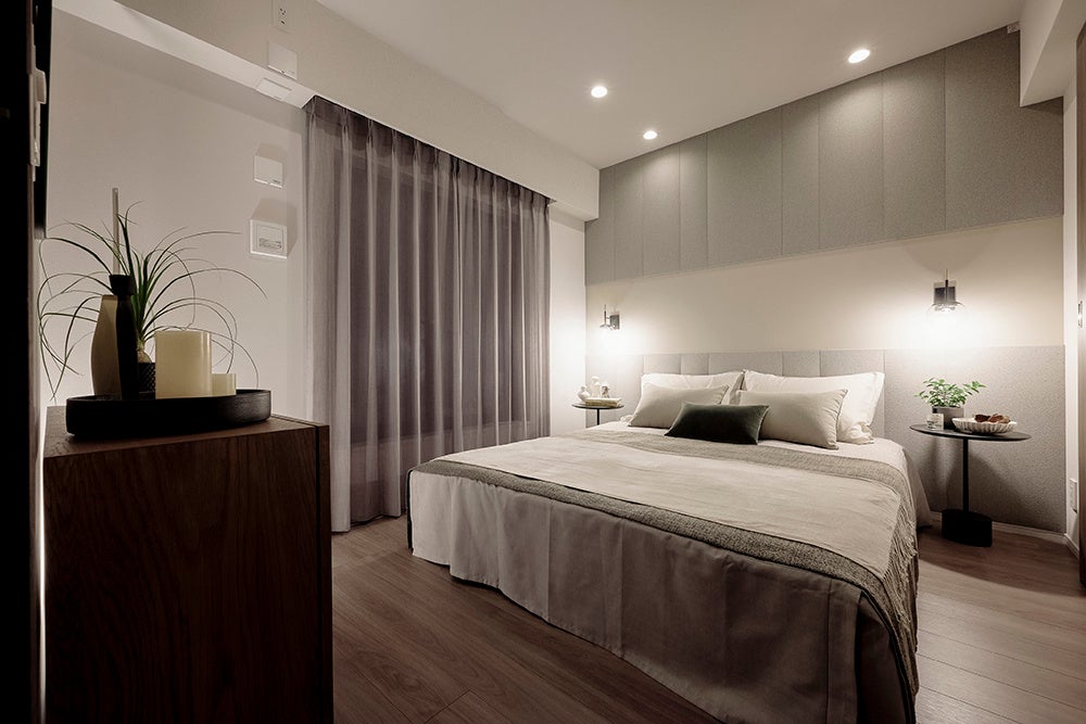 コンセプトは「Timeless JAPANDI」(JAPANESE×SCANDINAVIAN)。府中という立地が持つ、緑豊かで歴史のある土地柄と利便性の高さという両面の魅力を、日本の和に見られる”間”や自然との融合を重視する”詫び・寂び”に基づいたデザインと、北欧のシンプル且つ機能性を追求するデザインを融合することで表現しました。府中のランドマークとなる大國魂神社へのオマージュとして、「バウス府中」のマンション外観デザインのなかで用いられているルーバーを採用。日本の伝統的建築のディテールを現代的に再現しています。すっきりと片付いたシンプルでミニマルな空間は静謐な快適さを感じさせながら、柔らかな質感と温かみのある木・和紙・タイルなどの質感が住まう人を優しく包み込むようなインテリアを目指しました。