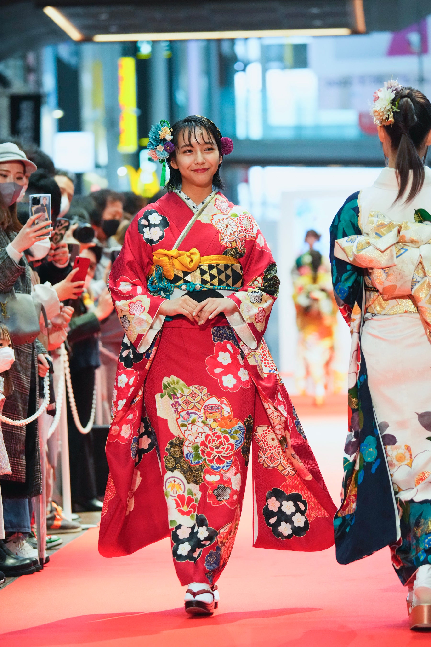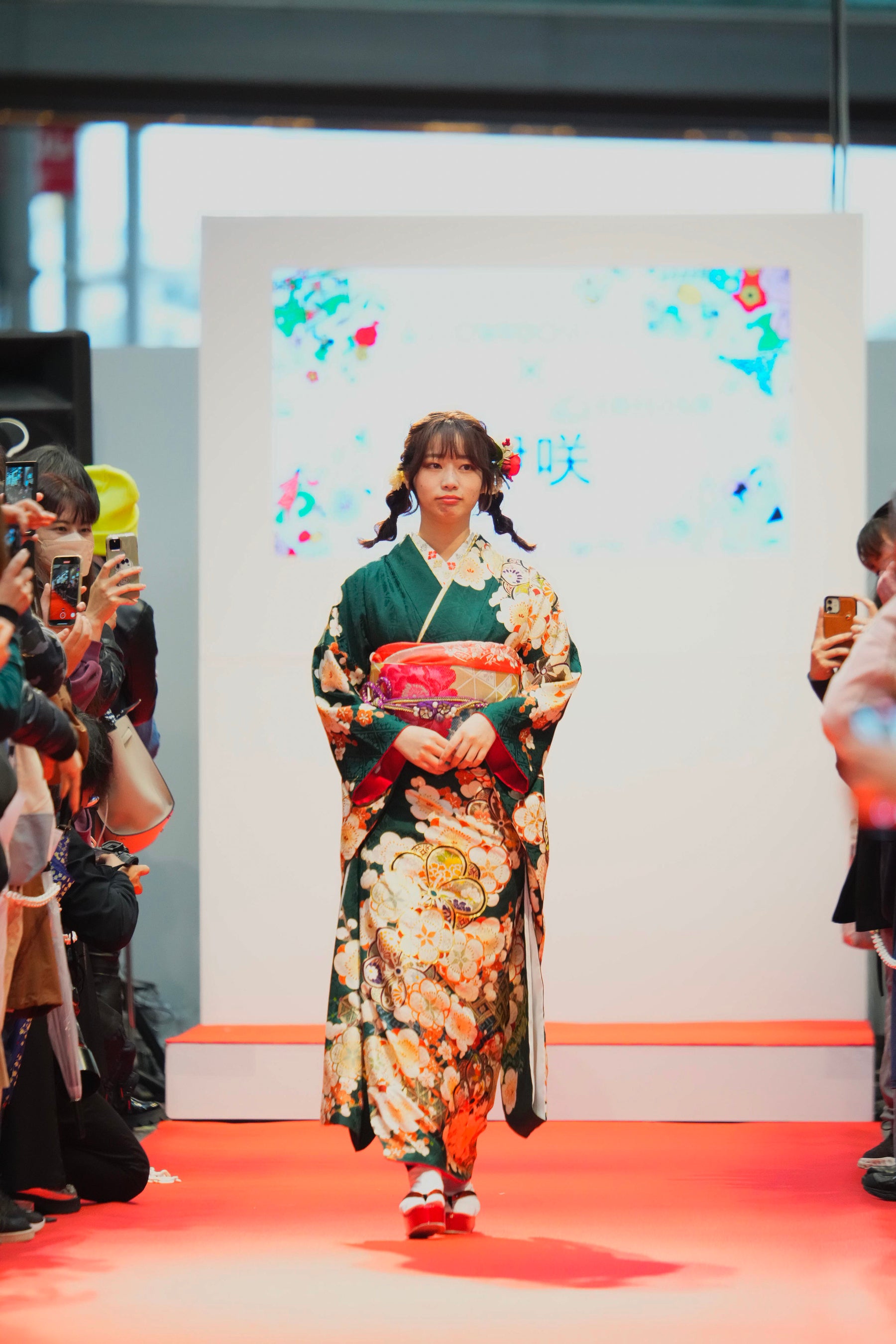 A. 地元での開催ということももちろん、お客さんとの距離の近さや空気感など、臨場感のあるいつもと全く違ったランウェイの思い出になりました。振袖でランウェイを歩く、という貴重な体験を地元神戸ですることができて楽しかったです。