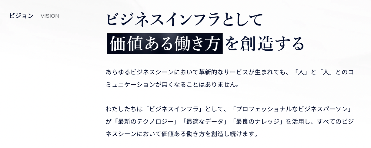 今回、新たに定義されたVISION「ビジネスインフラとして価値ある働き方を創造する」をもとに、「大きな変革」と「プロフェッショナル」という目指すべきものを表現しました。