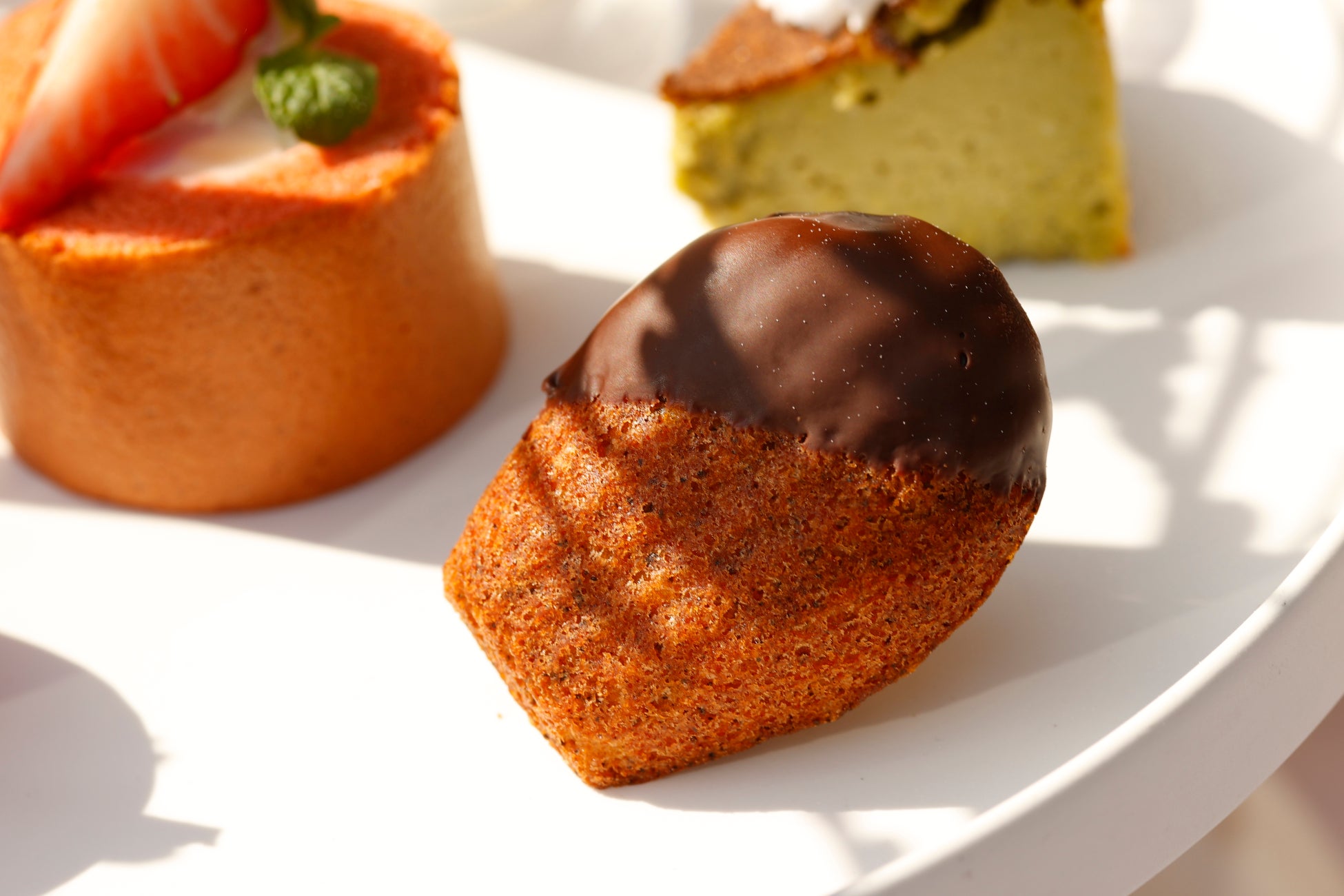 香ばしいほうじ茶を練り込んだマドレーヌ生地に、爽やかなレモンの皮をすりおろして加え、ほどよい軽やかさをプラスしました。パリッとしたチョコレートをコーティングし、食感のコントラストも楽しい一品です。