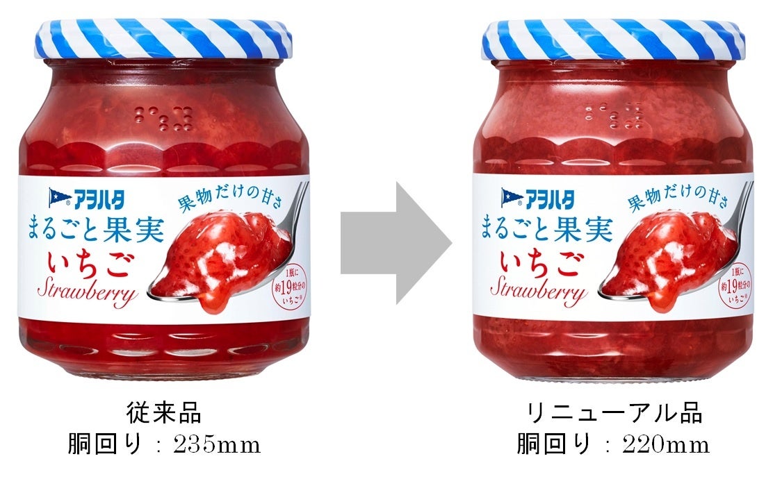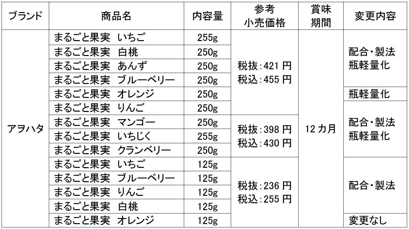 アヲハタ株式会社(本社:広島県竹原市、代表取締役社長:山本範雄、以下アヲハタ)は、果実と果汁で作ったフルーツスプレッド「アヲハタ まるごと果実」を、リニューアルします。2012年の発売より、商品の特徴であるみずみずしい果実感が好評で、毎年2桁の成長を続けています。発売10周年となる今年のリニューアルでは、配合・製法を見直しフルーツのおいしさをより高めるとともに、瓶を軽量化し環境負荷を低減した容器へ変更します。