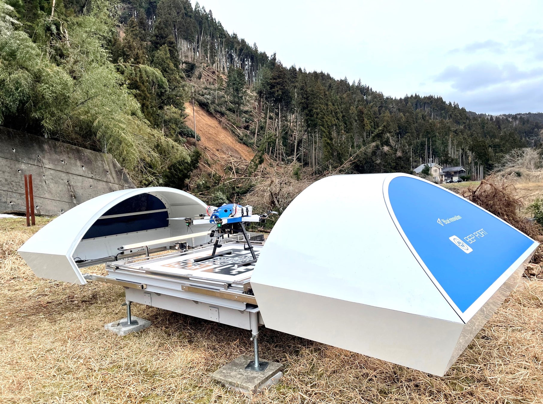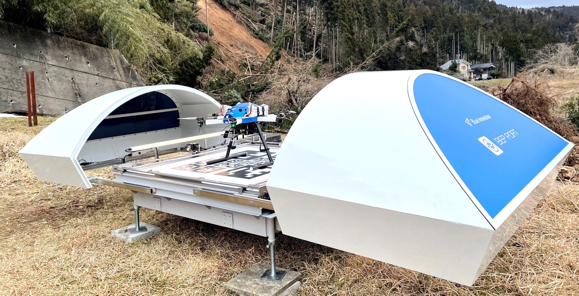 本取り組みは、輪島市内を流れる牛尾川(鈴屋川支流)に出来た土砂ダムの状況をブルーイノベーション開発のドローンポートシステム「BEPポート」※3を活用し、自動かつ定期的に離発着するドローンで土砂ダムを撮影・監視し、決壊の危険性有無を常時把握することで、二次災害による被害を未然に防ぐことを目的としています。実災害現場でのドローンポートシステムの社会実装は国内初※4となります。