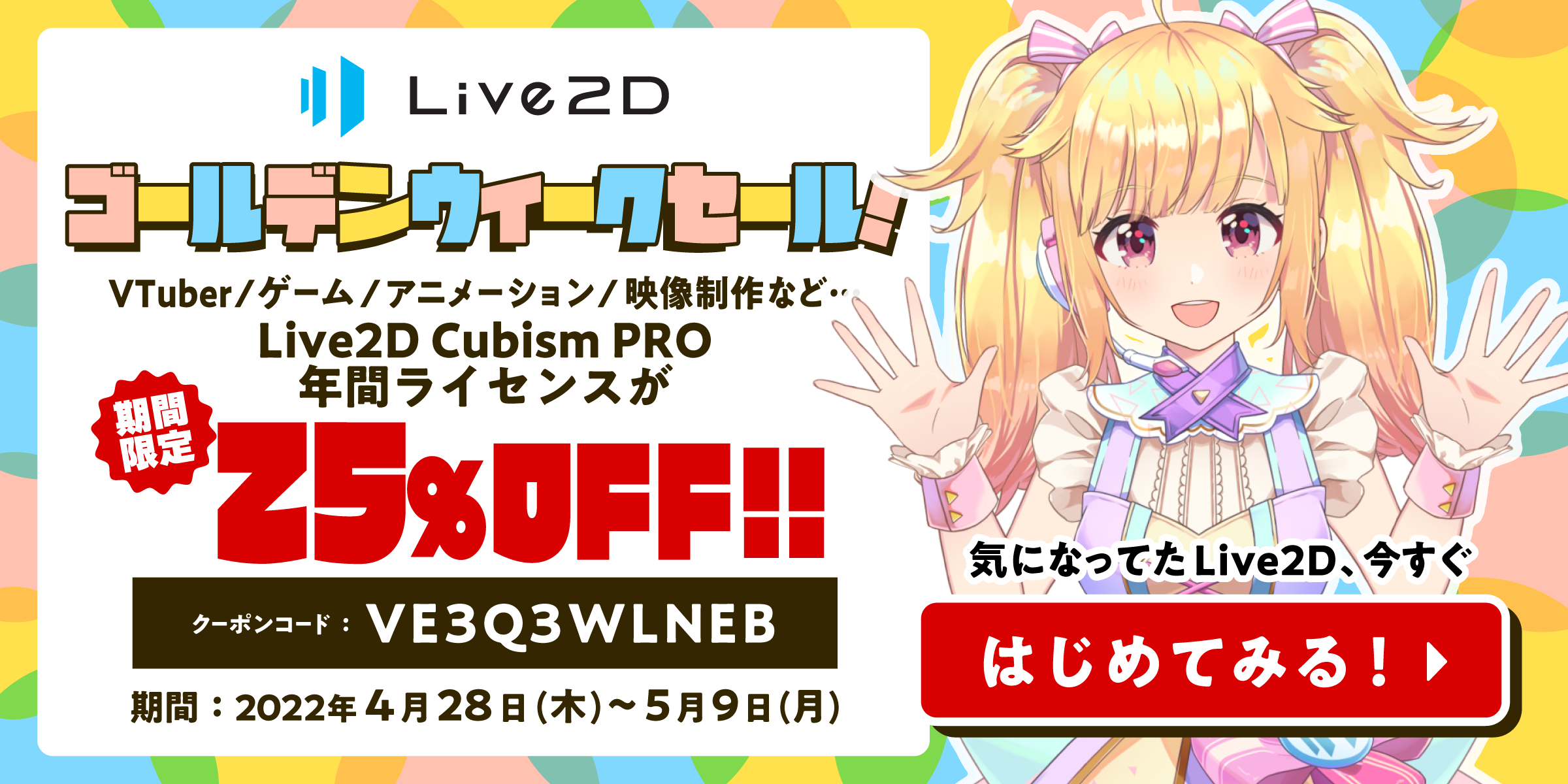 「Live2D」PROライセンスが25%OFF!期間限定 ゴールデンウィークセール スタート!2022年5月9日(月)まで
