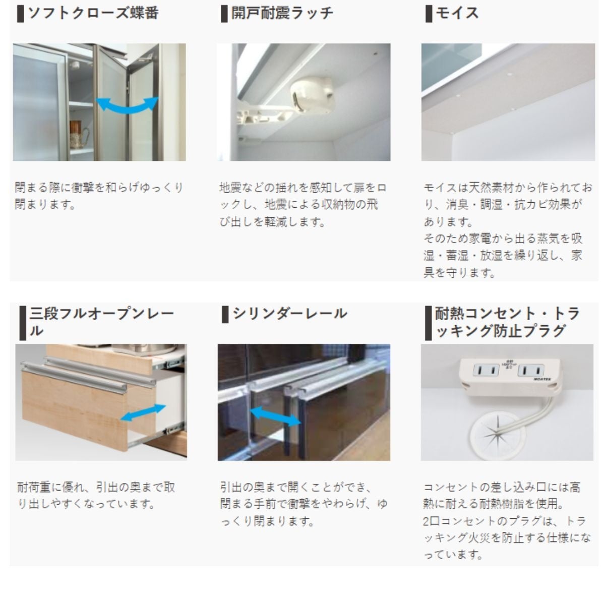 扉は静かに閉まるソフトクローズ仕様、ガラス扉には飛散防止フィルムを標準装備。安心と快適性の両立を目指しました。