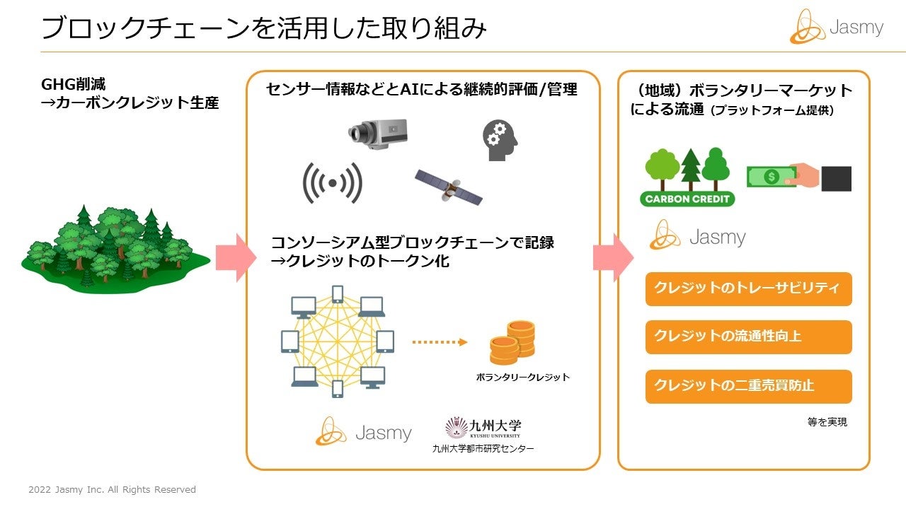 ジャスミー株式会社は、NCCCのカーボンクレジット創出、市場の活性化の取り組みに強く賛同するとともに、トークン発行をはじめ独自のブロックチェーン技術など様々な技術提供により、カーボンニュートラル、脱炭素社会の実現に寄与していく所存です。