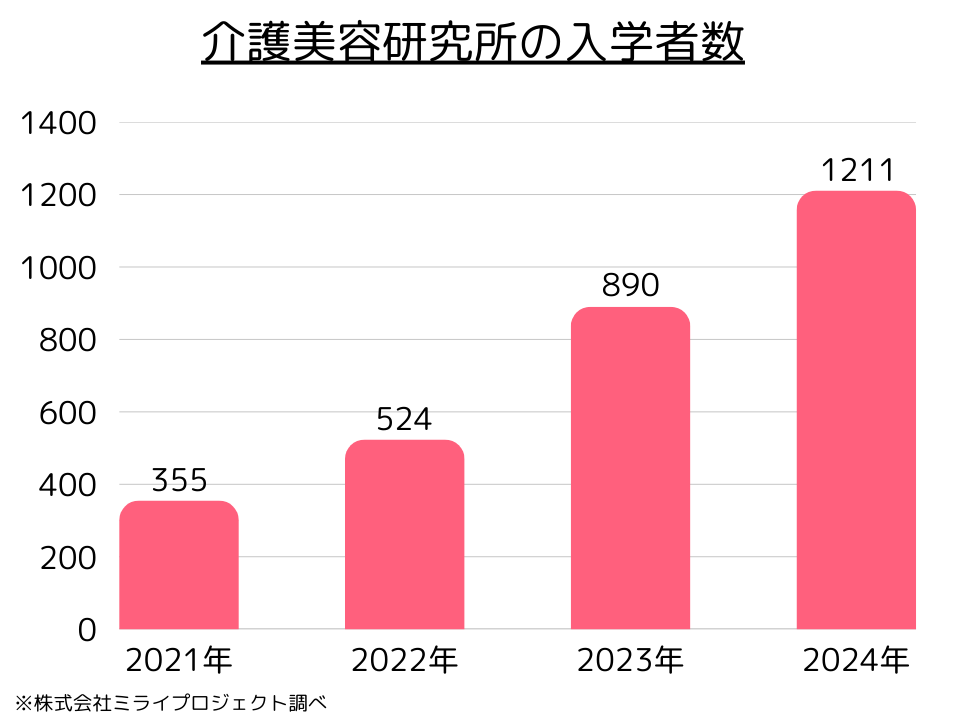 こうした社会動向を背景に「今後ニーズが拡大する分野で専門性を身につけたい」と考える受講希望者が増加しており、介護美容研究所のスクール入学者数は右肩上がりで推移しています。
