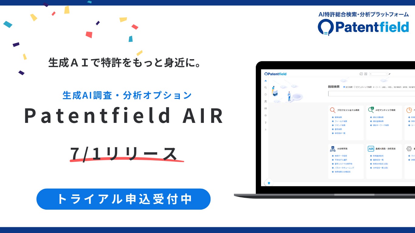 「生成AI調査・分析オプション Patentfield AIR」を2024年7月1日に提供開始し、本日よりトライアル申込を受付します。