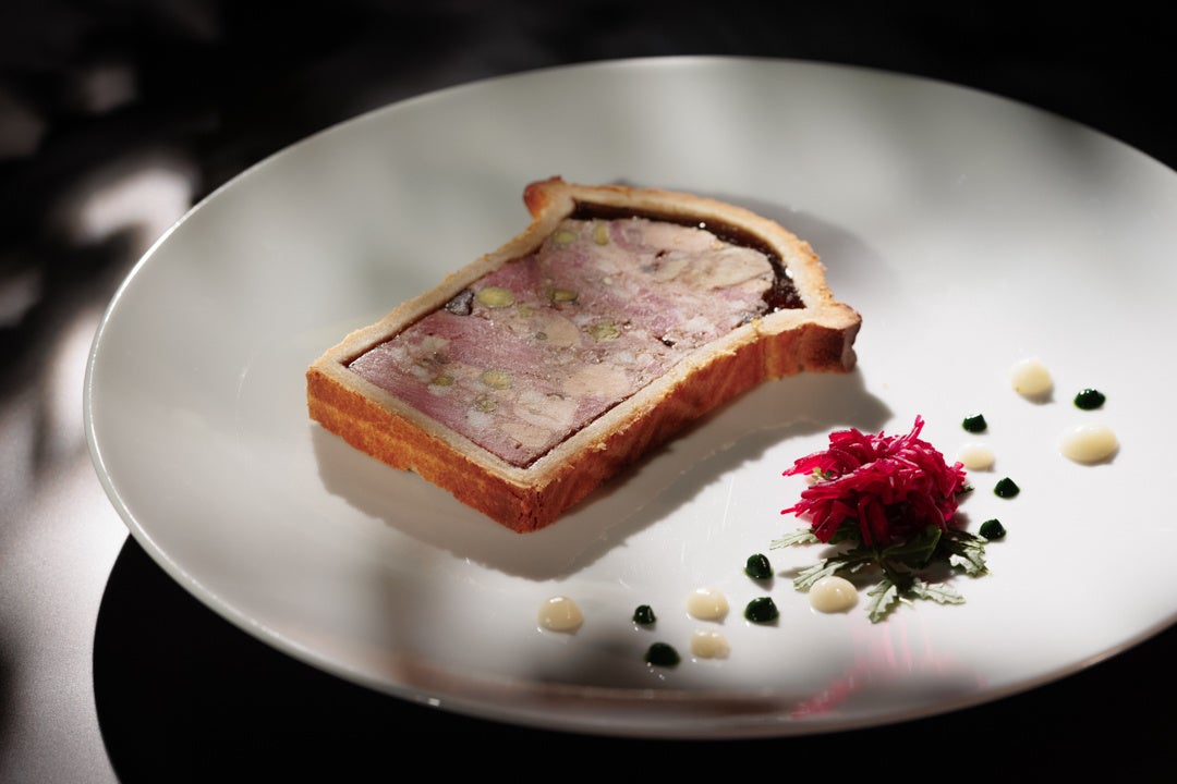 今回のパテ・クルートでこだわったのは、ジュレ、ファルス、パートが互いを補い合う三位一体の味わい。どこを食べても美味しくなることをイメージして作り上げました。