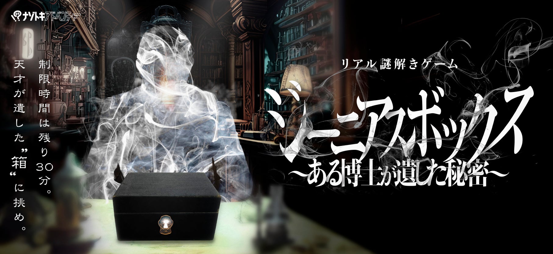 「100億円の謎」開催期間中でもある、この二日間は、同館6階ナレッジルームAにて開催される、ナゾトキアドベンチャー初の公演型リアル謎解きゲーム「ジーニアスボックス〜ある博士が遺した秘密〜」も開催が決定!