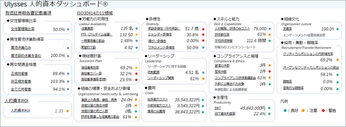 「Ulysses 人的資本ダッシュボード®」は、SAP SuccessFactors上で人的資本情報をダッシュボード化し適時確認できる仕組みであり、金融庁が公表した人的資本に関する有価証券報告書への記載義務項目と、ISO30414が規定する11領域の可視化、分析が可能です。手間のかかる有価証券報告書への記載事項も簡単に集計、出力できます。また、人的資本情報の管理についても、「何の情報をモニタリングすべきか」で悩む必要もなく、手軽に人的資本経営実現に必要な基本的な指標を可視化することができるので、人的資本情報を活用したPDCAのすべての局面において活用が可能です。
