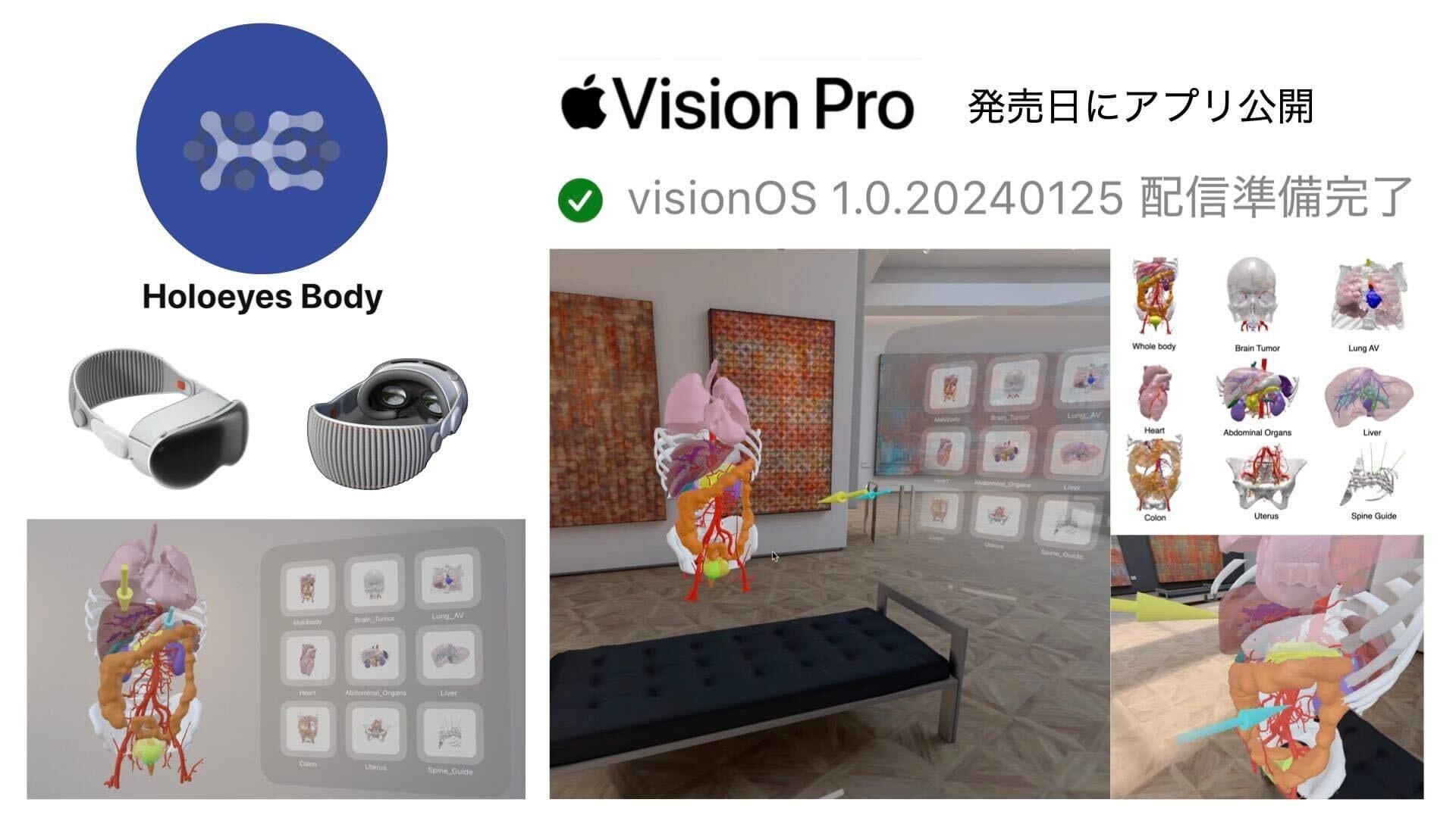 Holoeyesは、米国時間2024年2月2日のApple Vision Pro発売開始に合わせて、Vision OSアプリ「Holoeyes Body」をリリースし、同日のカンファレンス内で世界初披露しました。