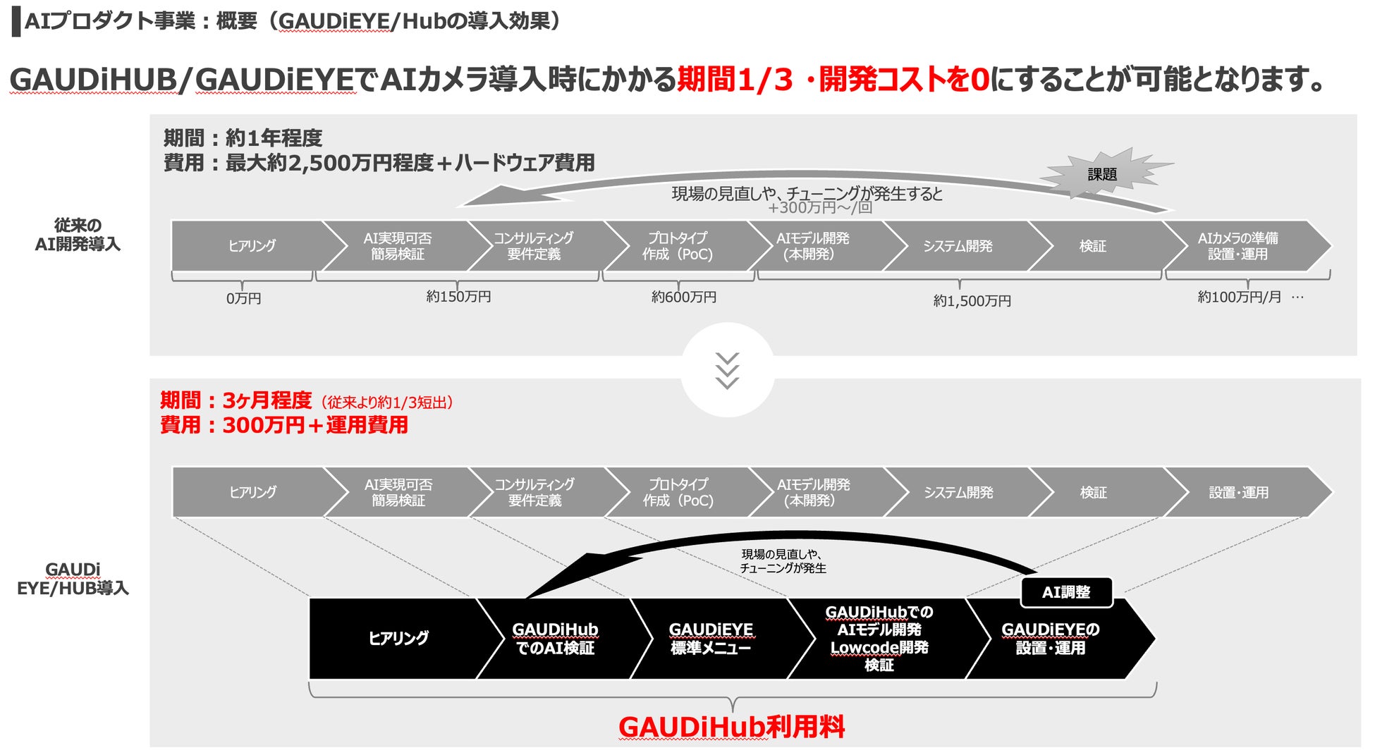 GAUDiHUB/GAUDiEYEでAIカメラ導入時にかかる期間を1/3 ・開発コストを半分以上削減することが可能です。