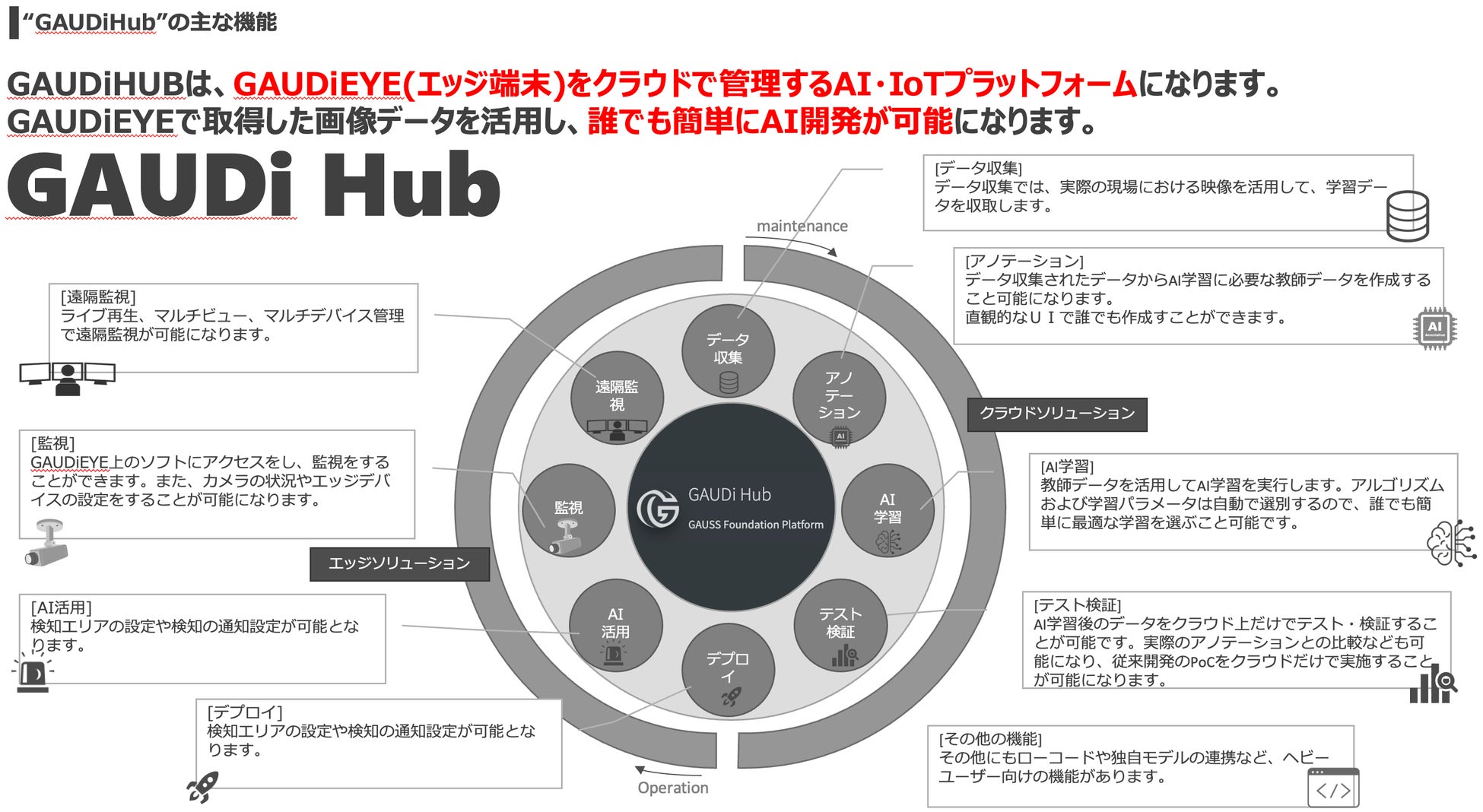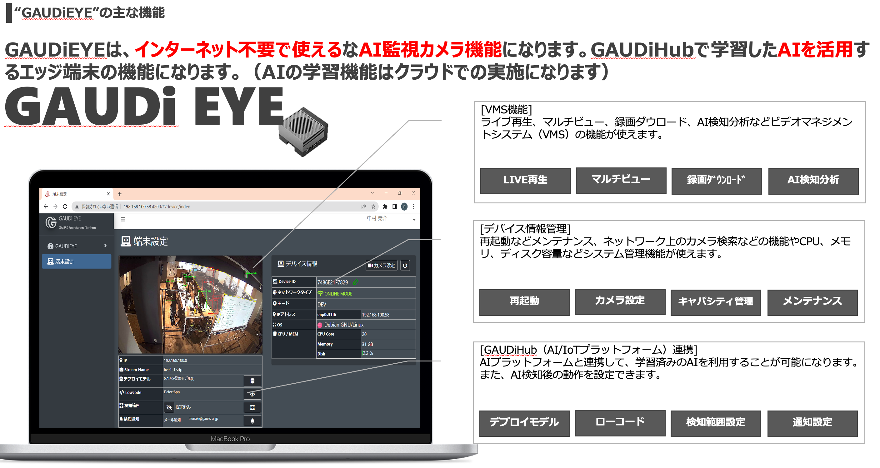 AIエッジデバイス「GAUDiEYE」は、既設のカメラにも接続可能なエッジデバイスで、ノーコードで独自AIが簡単に開発/搭載でき、AIを自由にアップデートができる「GAUDi HUB」と連携し、従来のAIカメラ導入コストを50%以上削減。コストを抑えつつ高品質なAIカメラが提供できるコンセプトが幅広い支持を集めています。製造・建設・介護など現場の安心・安全に貢献し、万が一の労災の予防・発生時の記録が残るAI機能搭載カメラです。