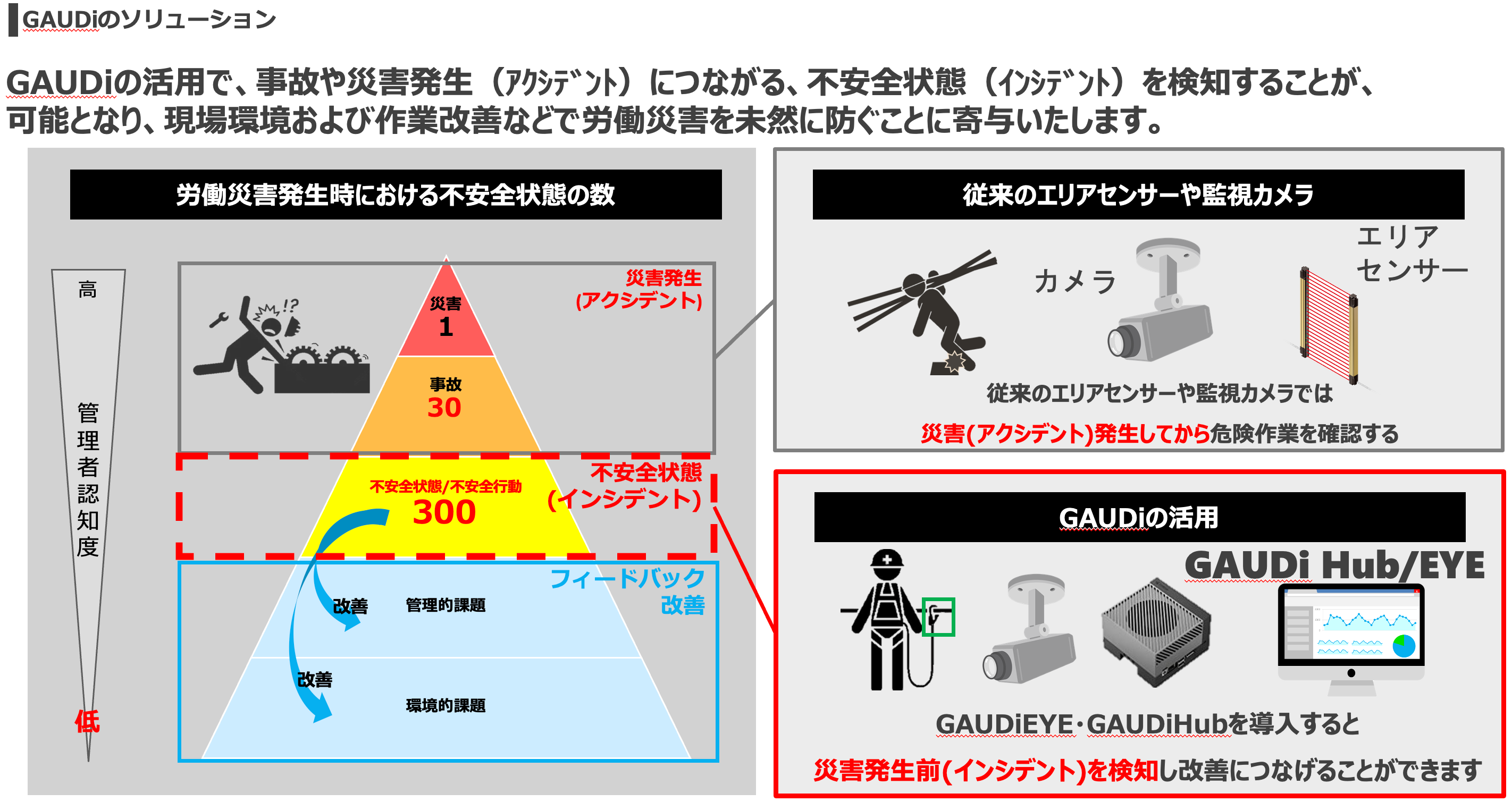 上記の活用で、事故や災害発生(アクシデント)につながる、不安全状態(インシデント)を検知することが可能となり、現場環境および作業改善などで労働災害を未然に防ぐことに寄与いたします。