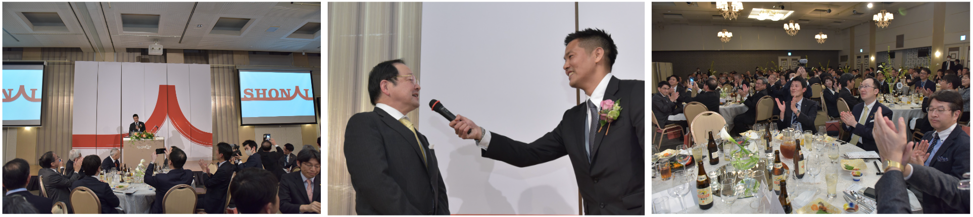 昨日、4月18日に、かつて荘内藩を治めた酒井家の18代目の当主、酒井忠久様が発起人となり、当社が受賞したニッポン新事業創出大賞の経済産業大臣賞、地方創生賞など4つの受賞をお祝いいただく会が開かれ、行政、経済、観光、教育、農業などの各分野から約200人の皆様にお集まりいただきました。会の中で、代表の山中から社名をSHONAIに変更する発表を行い、酒井様からは「微力ながら応援しています。今後ますますのご活躍とご発展をお祈りしています」とコメントいただきました。その後、会場の皆様からも拍手でご承認をいただきました。社名変更により、活動の起点である庄内地方へのコミットメントを更に強めるとともに、我々の事業活動そのものが全国の地方都市にとっての希望となるよう、従業員一同取り組んでまいります。