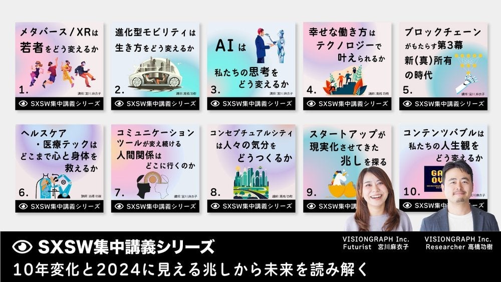 SXSW Japan Officeを務めるVISIONGRAPHでは、SXSWに関連する有料の講演メニューを、ご希望のテーマに応じてカスタマイズして提供しています。これまで13年にわたりSXSWを定点観測してきたVISIONGRAPHでは、SXSWでのテクノロジーやトレンドの変遷を振り返る「SXSW集中講義シリーズ」を、今年初めて全10回のオンライン講義シリーズとして実施します。