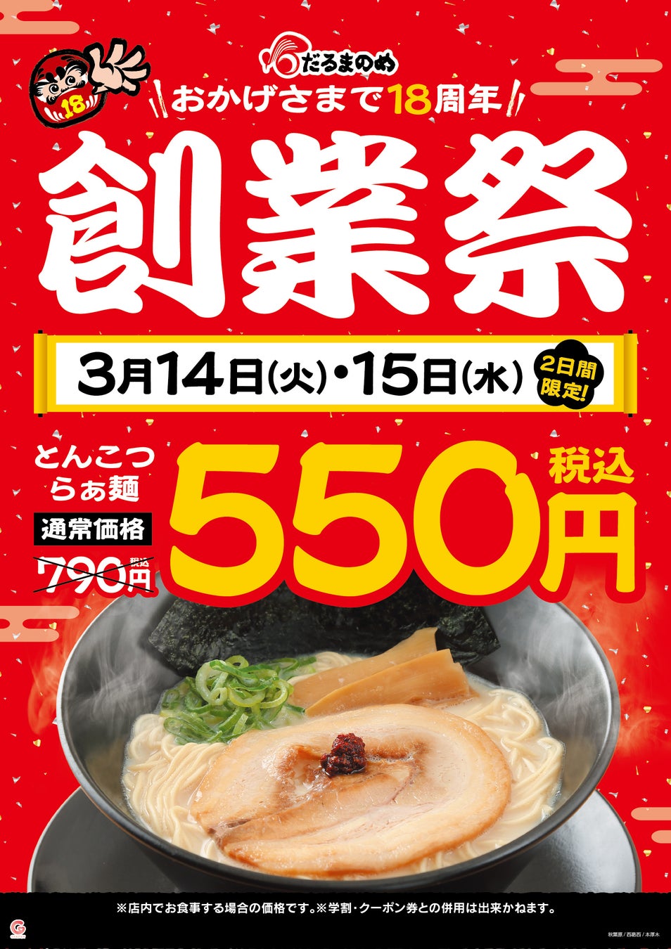 株式会社ガーデン(本社:東京都新宿区 代表取締役社長:川島賢 以下「当社」)が運営する「だるまのめ」は、皆様にご愛顧をいただき2023年3月に18周年を迎えます。これを記念し、2023年3月14日(火)と3月15日(水)の2日間限定で、通常「とんこつらぁ麺」を税込790円のところ、税込550円にて提供します。