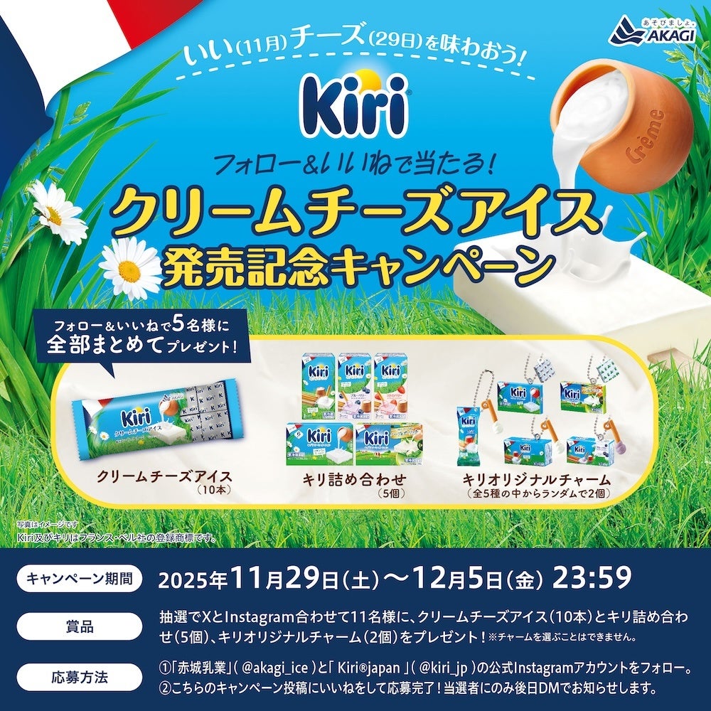 発売を記念し、2025年11月29日(土)「いい(11)チーズ(29)」にあわせて、豪華賞品が当たるSNSキャンペーンを、2025年11月29日(土)〜12月5日(金)に実施いたします。キリと赤城乳業の公式X(@kiri_japan、@akagi_cp)、公式Instagram(@kiri_jp、@akagi_ice)をフォローの上、キャンペーン投稿を「リポスト」または「いいね」していただいた方を対象に、抽選で合計11名様(X:6名様、Instagram:5名様)に素敵な賞品が当たります。