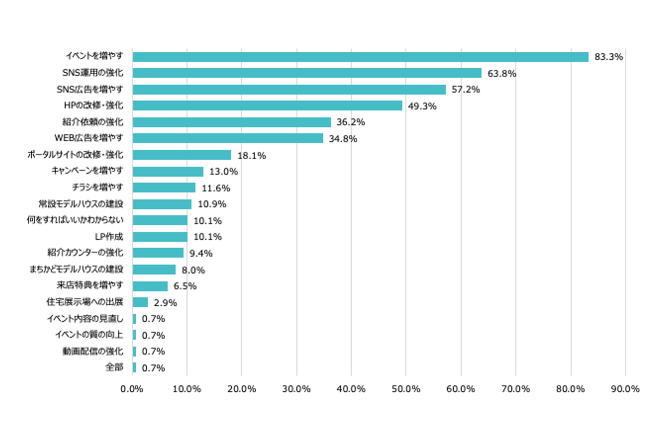 一方で、コロナ禍を経て社会活動が戻りつつある中で、リアルイベントへのニーズも復活しています。企業はイベントを増やすことで、実際に顧客と対面し、信頼感を構築することを目指しています。特に住宅業界では、実際の物件を見たり体験したりすることが重要であるため、イベントが再び重視されています。企業は、SNS運用やイベント開催で顧客との直接的な接点を増やし、信頼を築くことが集客に効果的だと認識していると考えられます。また、「紹介依頼の強化」が施策として挙げられているのは、住宅という大きな買い物において他者の信頼できる意見が購買決定に強い影響を与えることが背景にあります。
