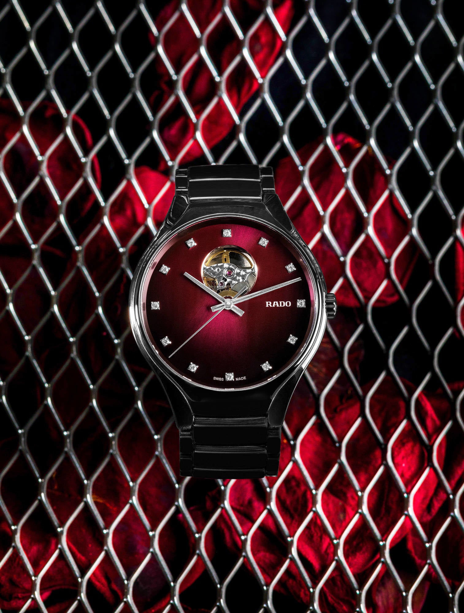 恒久の美しさを誇るブラック ハイテクセラミックにセンシュアルなレッドのダイアルが溶け合い、ダイアルのオープンハートからは、高品質自動巻ムーブメントを覗き見ることができます。数字の代わりに配置された12 ポイ