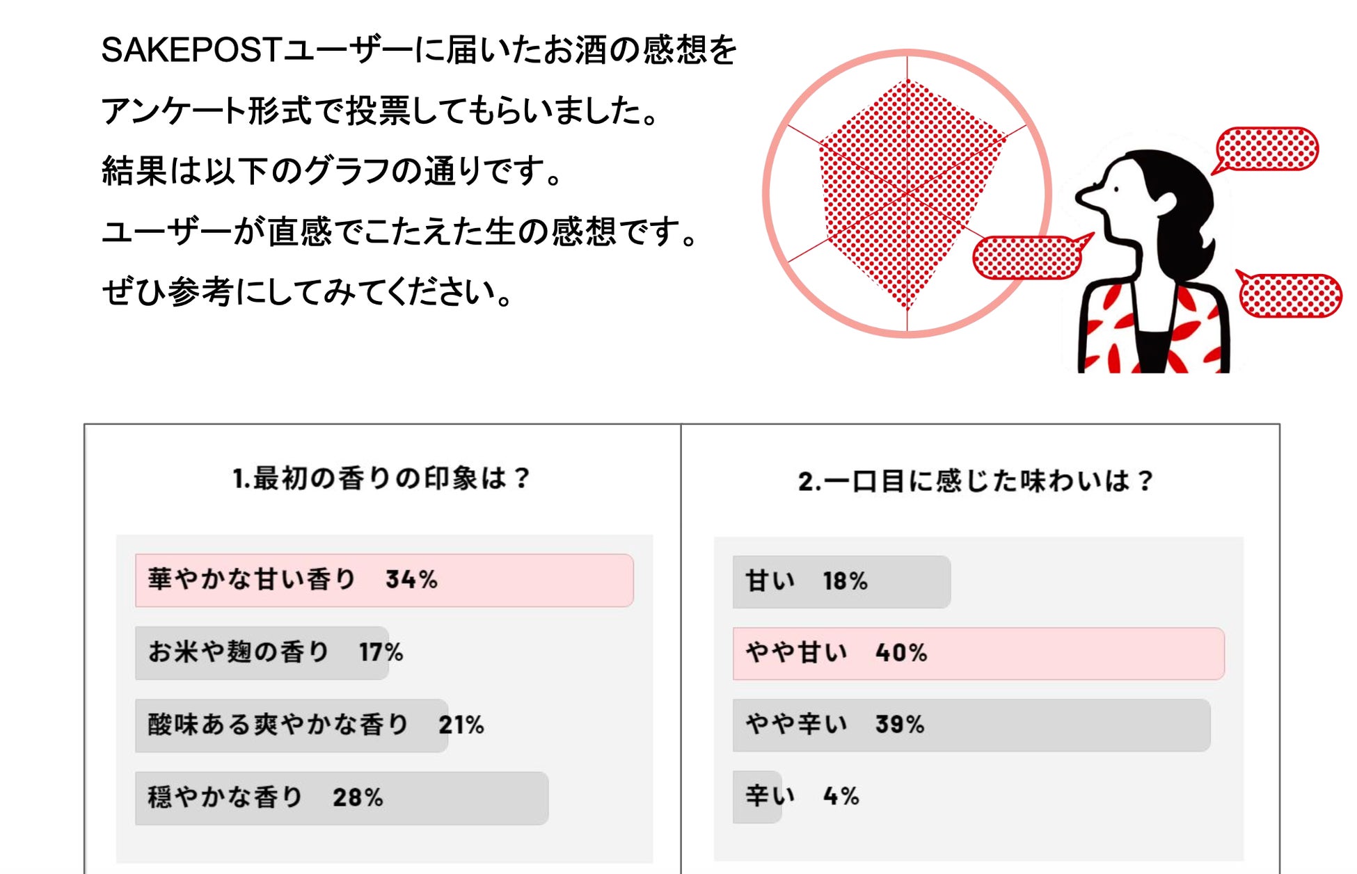 毎回ユーザーに4−5問の質問に回答していただき、お酒の味や香りの感じ方、相性の良い料理、温度帯など、さまざまな回答を集計して、ユーザーがもつこの銘柄のイメージをグラフ化したものを酒蔵にお届けします。