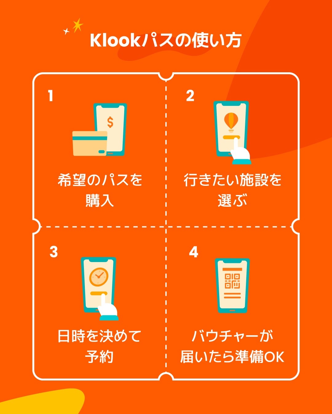 「Klookパス」の使い方:購入後にアカウント予約画面の「予約」ページより行きたい施設を選んで予約してください。施設ごとに日時を選んで予約可能です。予約後は各施設のバウチャーが届きます。メールまたはアプリ内のバウチャーを当日施設で提示し、ご利用ください。