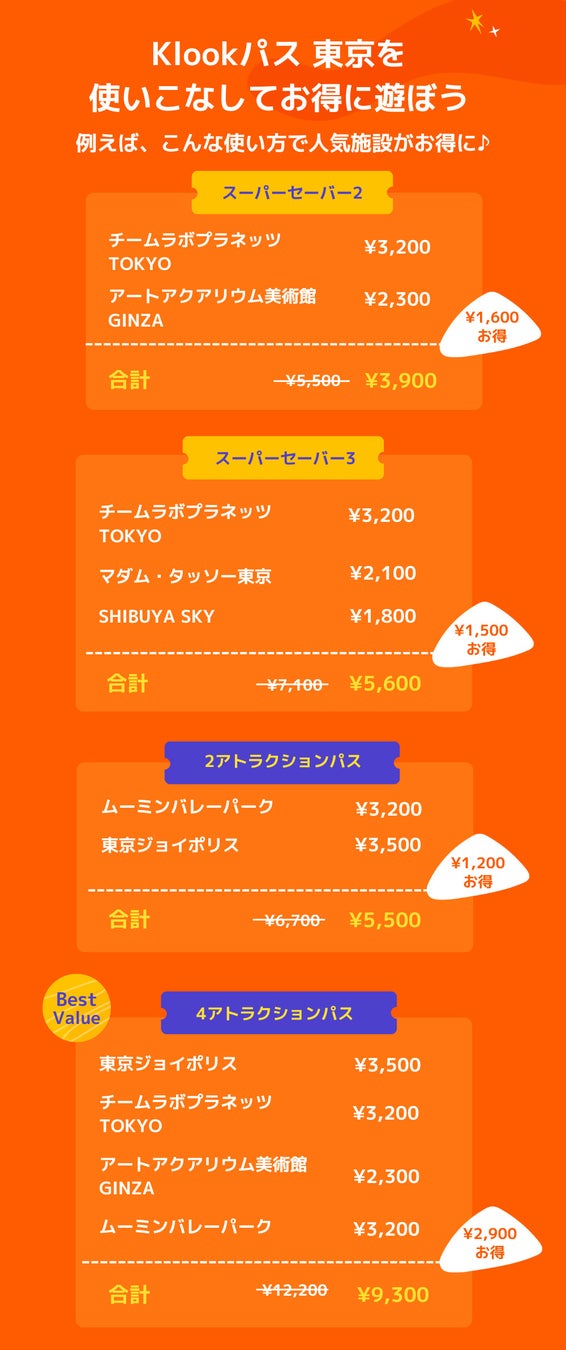 お手頃価格の施設チケットをまとめた「スーパーセーバー」と、高価格の施設チケットも贅沢に含めたお得度の高い「アトラクションパス」があり、それぞれ2〜4施設選べます。例えば「4アトラクションパス」(9.300円)を購入し、東京ジョイポリス、チームラボプラネッツTOKYO、アートアクアリウム美術館GINZA、ムーミンバレーパークを選ぶと、それぞれ単品で購入した合計金額12,200円よりも2,900円お得になります。