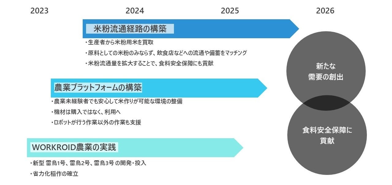 「徹底した省力化の実現」をコンセプトとして、農業ワークロイドを順次開発・投入し、米粉用稲作から米粉の流通までを一気通貫で行うことができる省力化農業を確立し、全国に広めていきます。また、収穫した米は米粉にして流通させることで、新たな需要創出と食料安全保障にも貢献し、持続可能な農業の実現を目指してまいります。