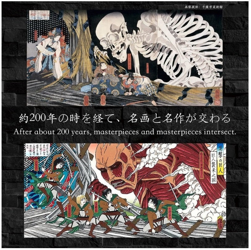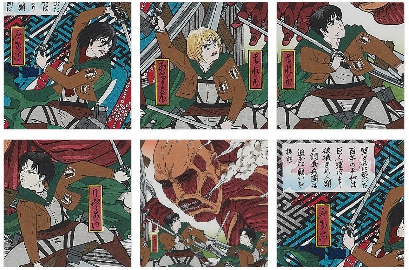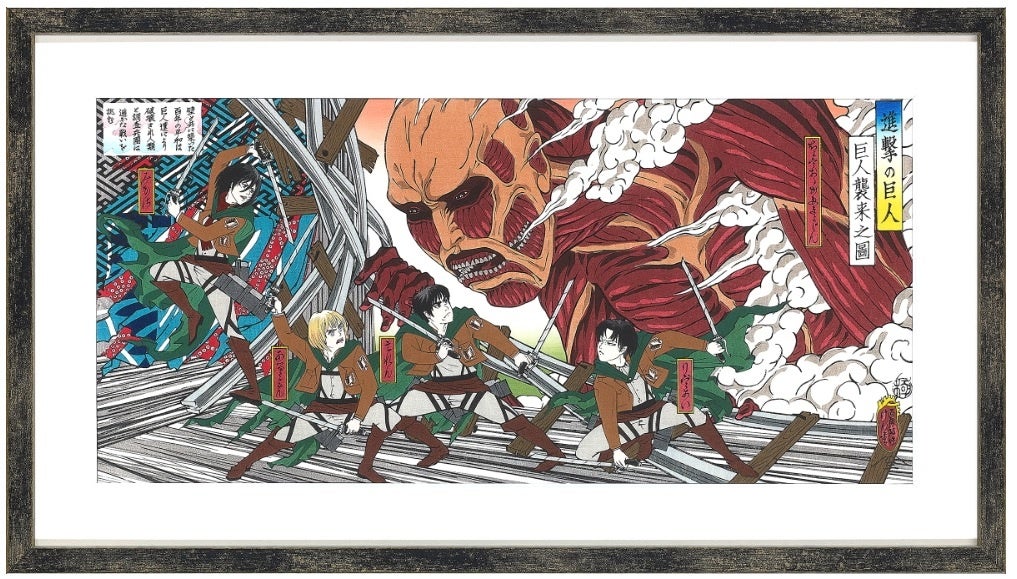日本画家の塩崎顕氏がこの名画と進撃の巨人の世界観を見事にマッチさせた原画を描き下ろし、約200年の時を経た日本を代表する作品同士のコラボレーションが実現。2023年2月に発売されたこの「進撃の巨人 浮世絵木版画『巨人襲来之図』」は即日で完売となるほどの人気を集め、11月には新色バージョンも発売されました。