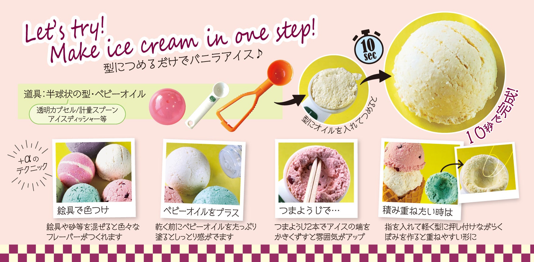 製品に同梱の説明書には、ワンステップで作れるバニラアイスのレシピも掲載し、フェイクスイーツづくりがはじめての方にもトライしやすくなっています。