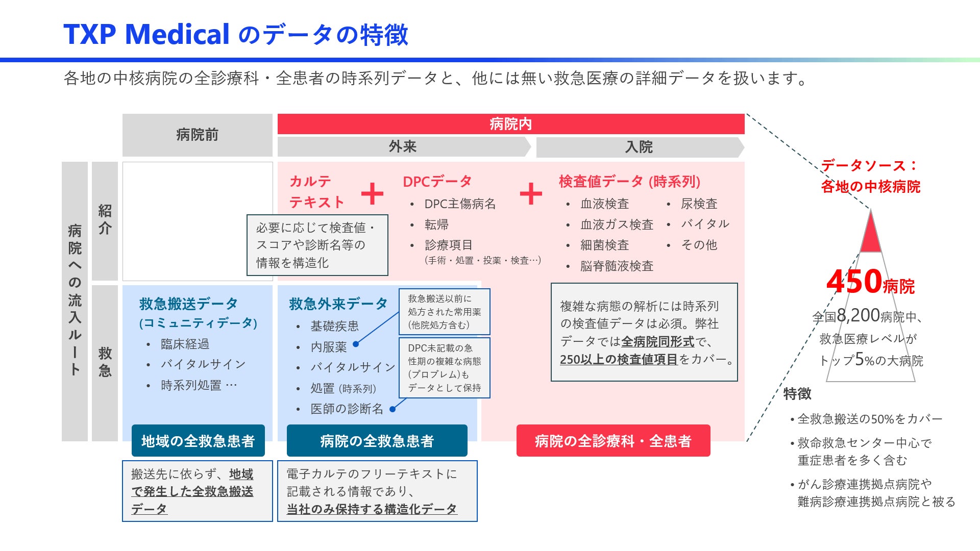 TXP Medicalは救急医療DXを通じて、日本中の病院・救急隊・研究者の幅広い支持を受けてきました。この度、これらのネットワークと技術を結集し、製薬企業向けの価値の高い新サービスのリリースに至ることができました。救急医療の枠にとどまらず、医療水準の向上を実現し、患者に還元できるリアルワールドデータの利活用モデルを創出して参ります。