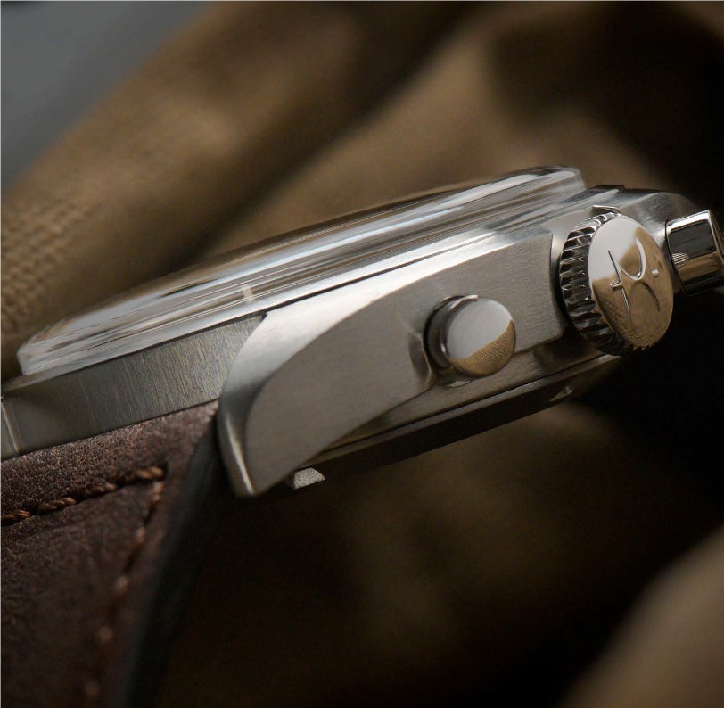 リューズとプッシュボタンを保護するために右側が膨らんだ形状のケースや、立ち上がりのある両面反射防止加工の “ボックス型”サファイアクリスタルなど、航空時計としての特徴もまた、必須のアビエーションツールとして使用されてきたその歴史を物語っています。