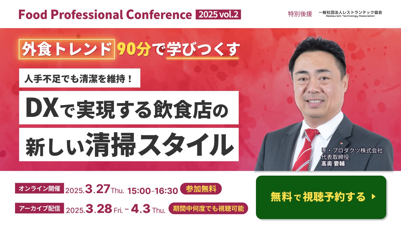 この度、清掃資材の販売・製造および清掃サービスを提供するリ・プロダクツ株式会社(代表取締役:髙奥 要輔)は、2025年3月27日 (木) に開催される「Food Professional Conference 2025 Vol.2」において、『DXで実現する飲食店の新しい清掃スタイル』をテーマに講演することをお知らせいたします。