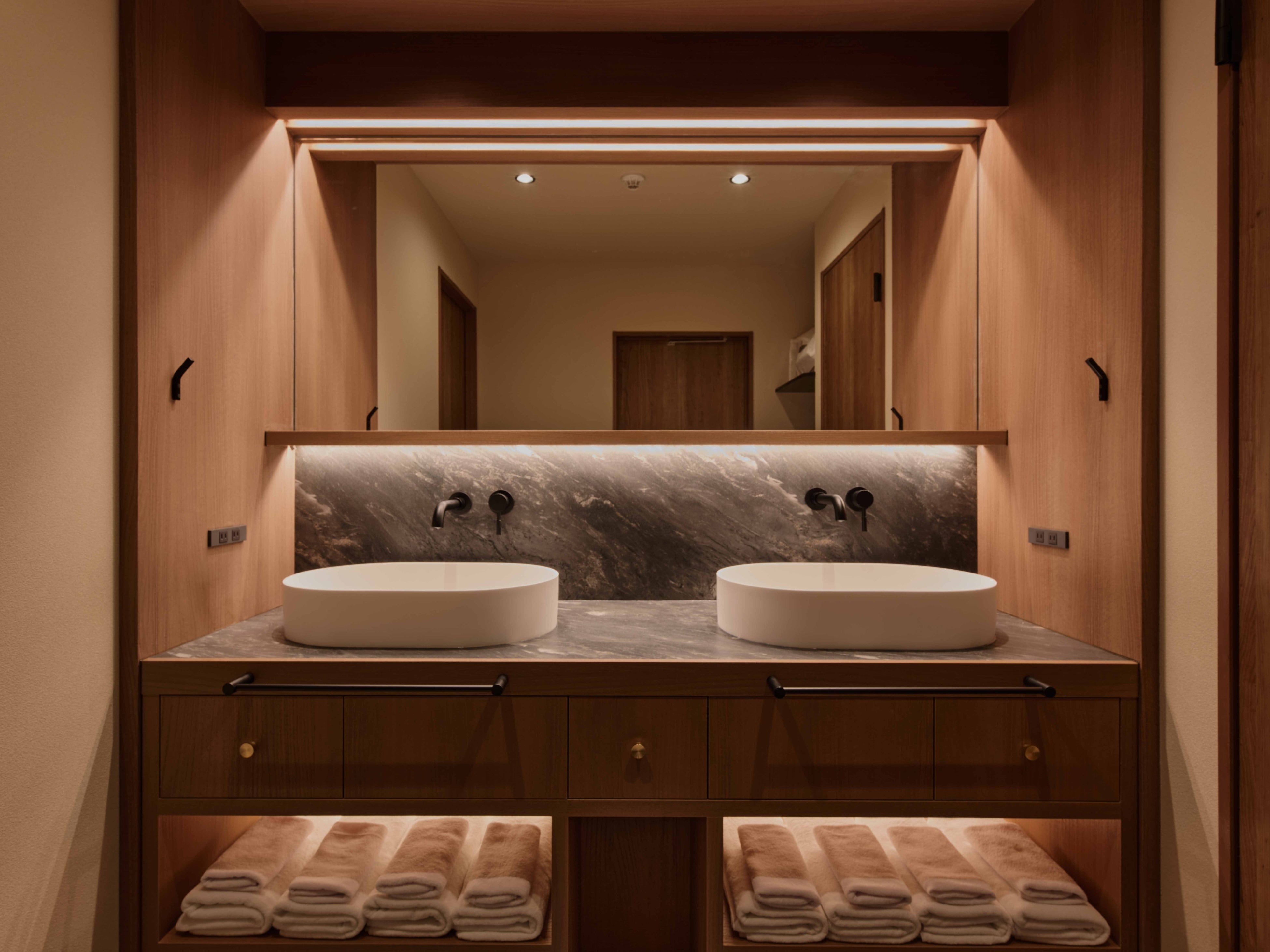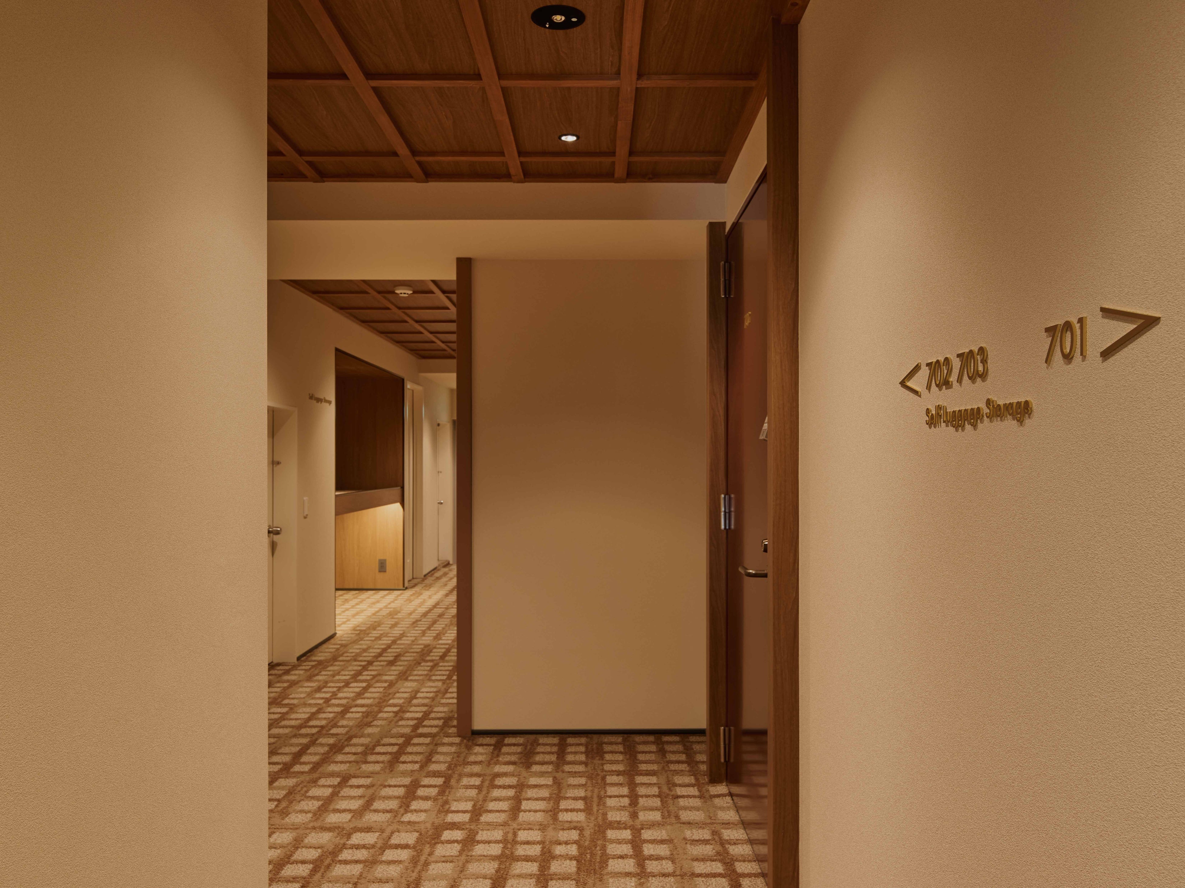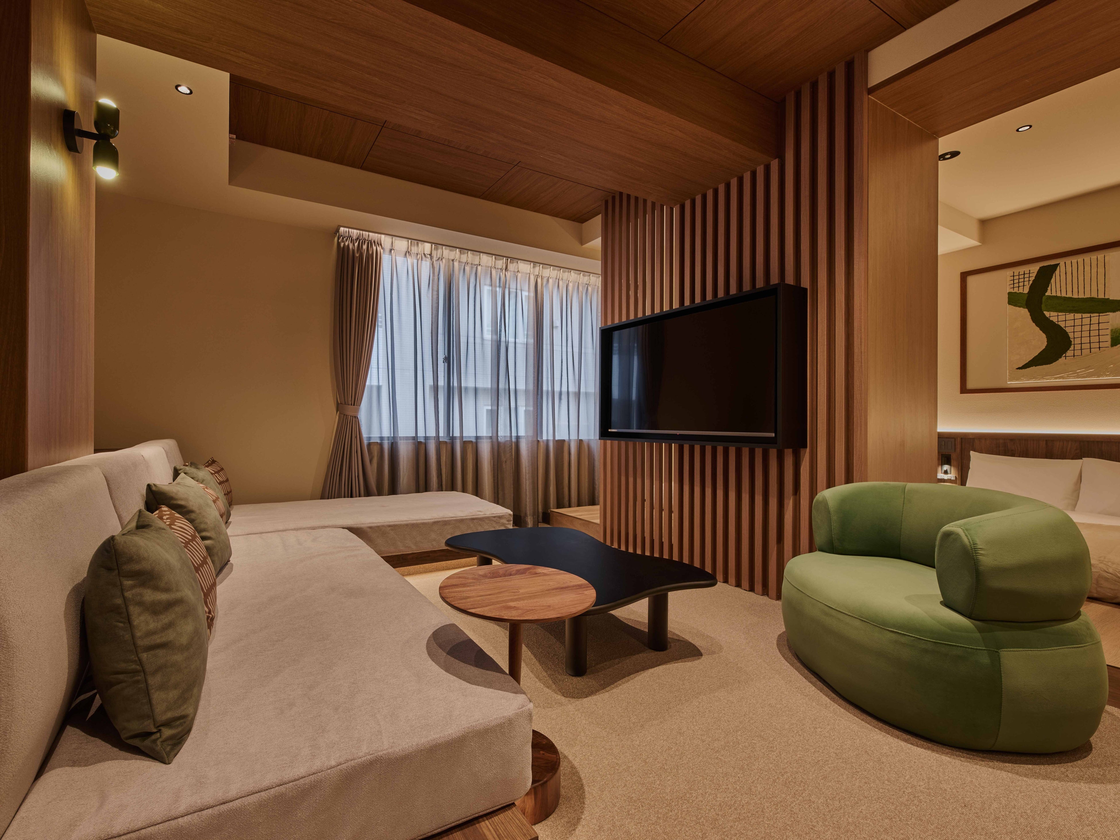 「Urban Retreat」をテーマに、天井の木目デザインや壁面の石の素材感、各所に施した間接照明が洗練された上質な空間を生み出し、グリーンのアイテムがミッドセンチュリーの遊び心と温かみを添えます。それぞれの過ごし方に寄り添うゾーニングと心地よいインテリアが、思い思いのくつろぎを自然と生み出します。