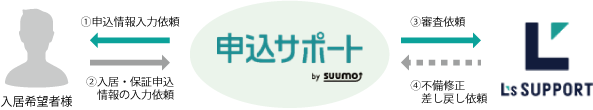 「申込サポートby SUUMO」は、申込関連業務をユーザー、不動産会社共にWeb上で完結できる「申込サポート by SUUMO」を提供いたします。ユーザーが専用のWeb申込フォームを通じて、情報を入力、不動産会社および関連事業者で審査後、必要に応じた修正などもweb上で完結、不動産会社にとっては申込業務の効率化、お部屋探しをしているユーザーにとっては申込の手間が軽減します。
