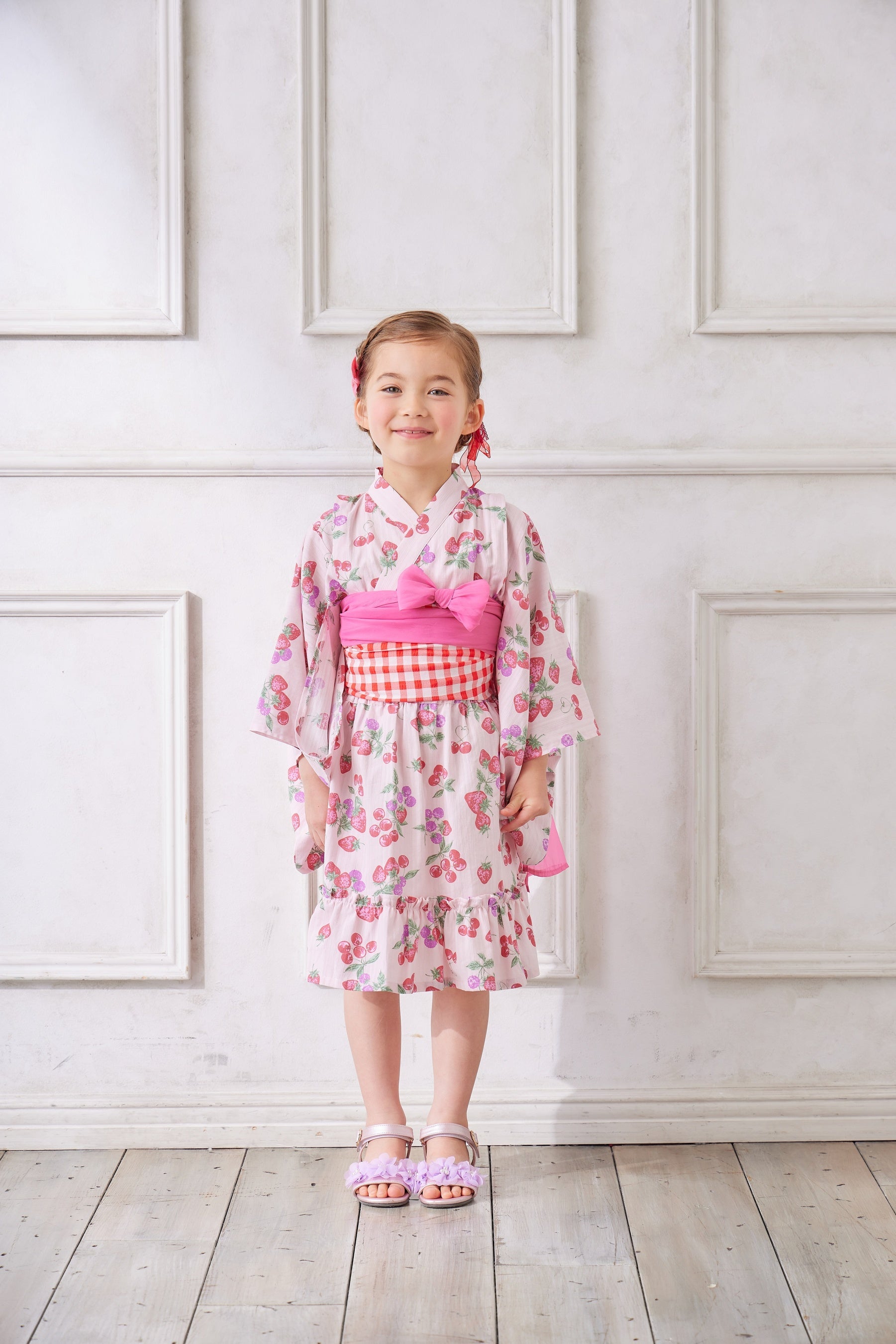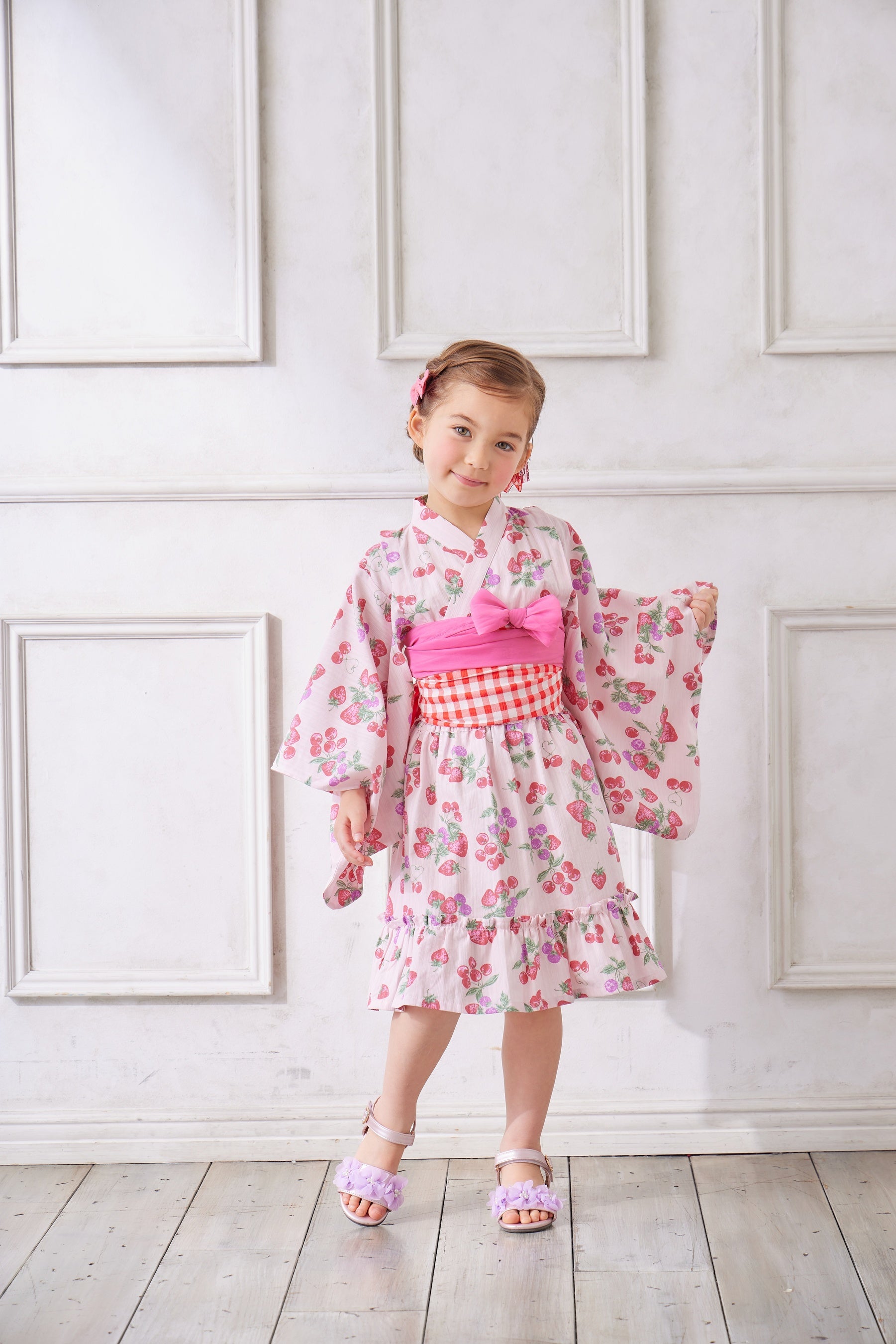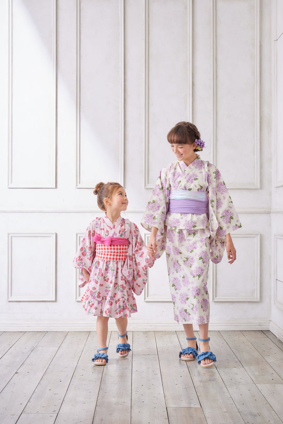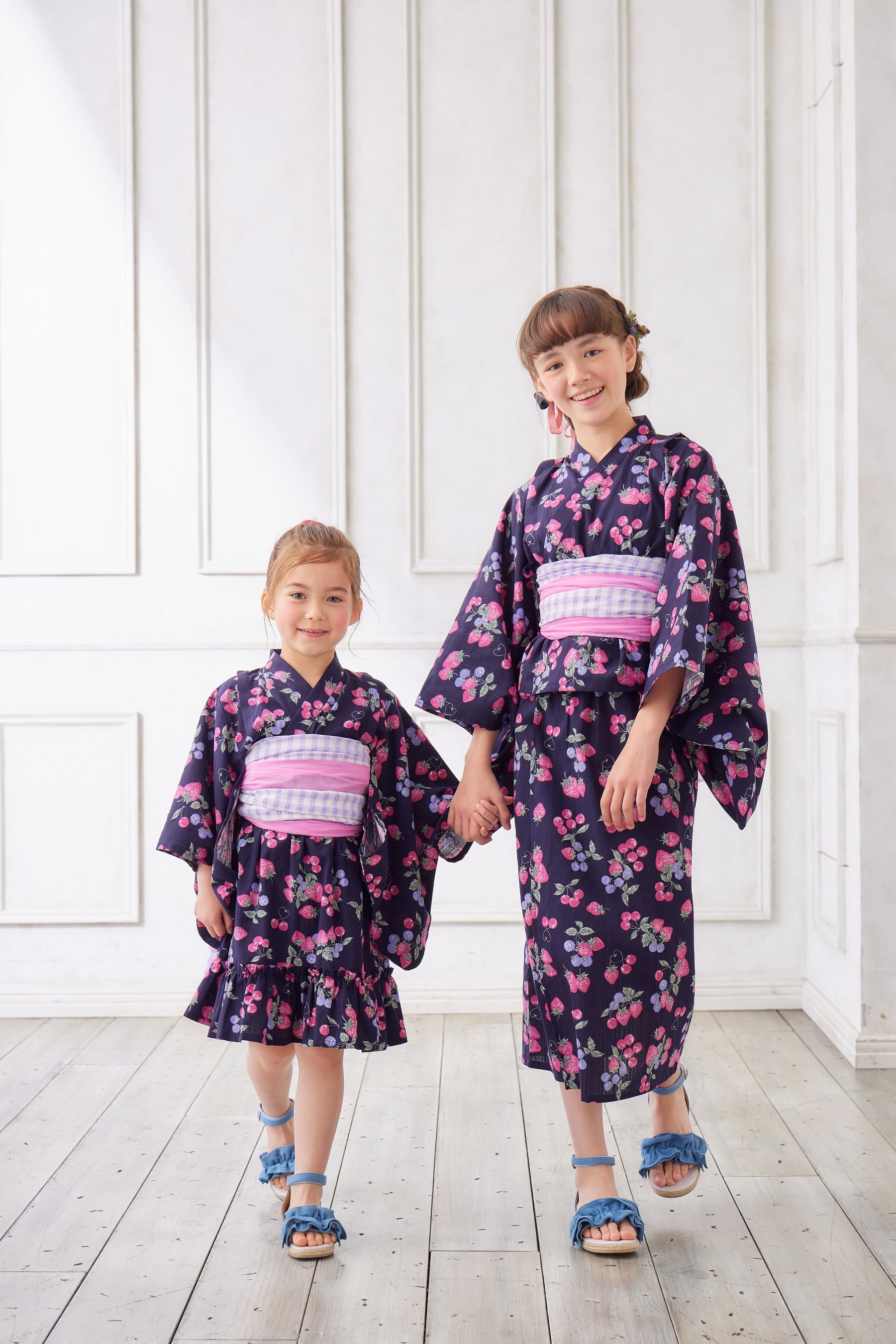 子供向け浴衣は、上下セパレートタイプのデザインで、兵児帯(へこおび)を採用し、簡単に着せ付けられ、着崩れしにくいよう工夫しました。とびきりCuteなイチゴデザイン2柄と、ちょっぴりお姉さんっぽいアジサイデザイン2柄の計4柄展開。それぞれショート丈とロング丈の2タイプがあり、計8つのデザインから選べるので、姉妹やお友達とのお揃いコーディネートを楽しんでいただけます。