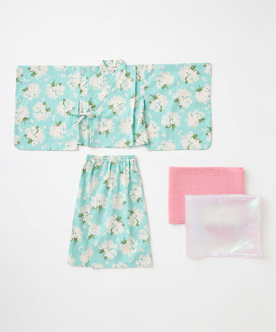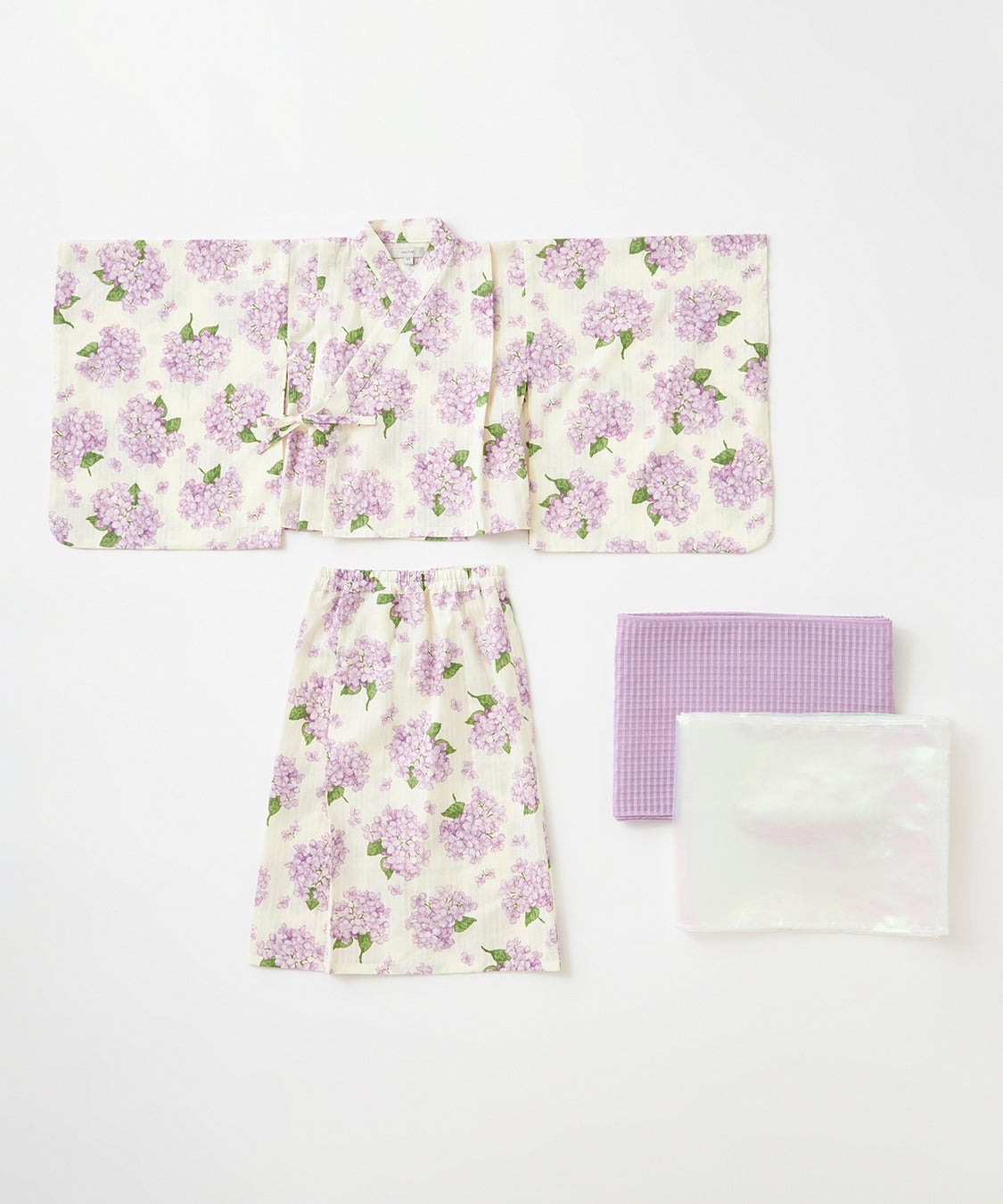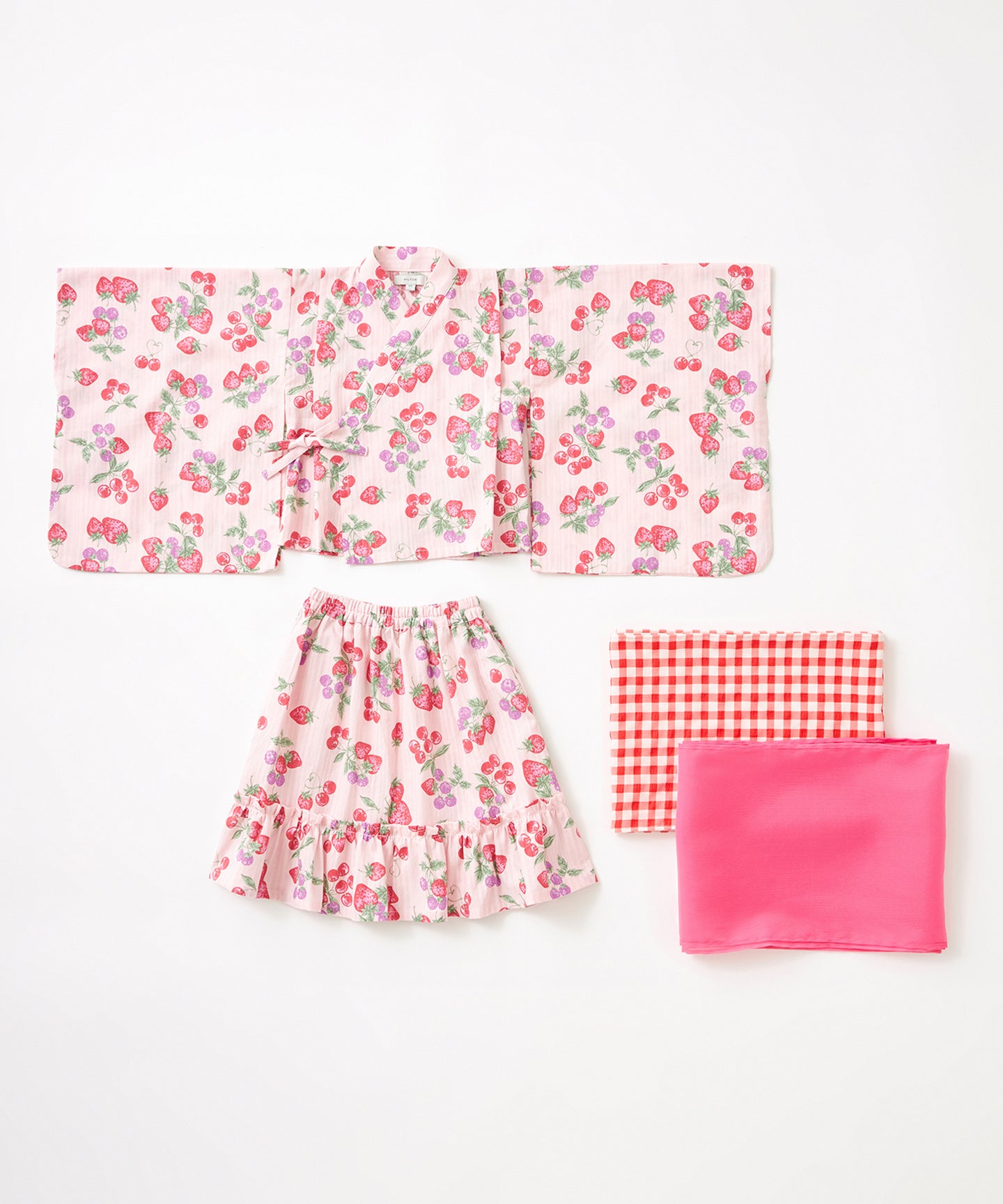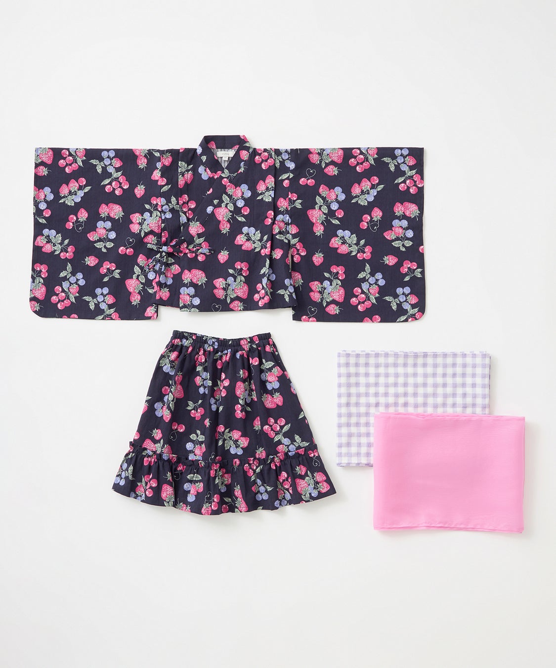 子供向け浴衣は、上下セパレートタイプのデザインで、兵児帯(へこおび)を採用し、簡単に着せ付けられ、着崩れしにくいよう工夫しました。とびきりCuteなイチゴデザイン2柄と、ちょっぴりお姉さんっぽいアジサイデザイン2柄の計4柄展開。それぞれショート丈とロング丈の2タイプがあり、計8つのデザインから選べるので、姉妹やお友達とのお揃いコーディネートを楽しんでいただけます。