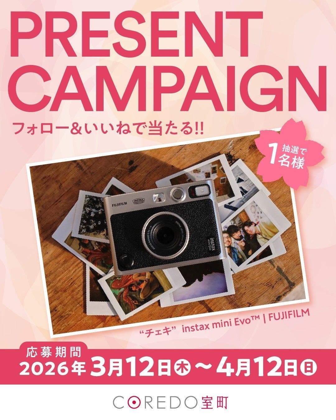 COREDO室町・COREDO日本橋・銀座ベルビア館のいずれかの公式Instagramアカウントをフォローして、対象投稿に「いいね!」をすると、抽選で“チェキ”instax mini Evo™ | FUJIFILMが当たるプレゼントキャンペーンを開催いたします。