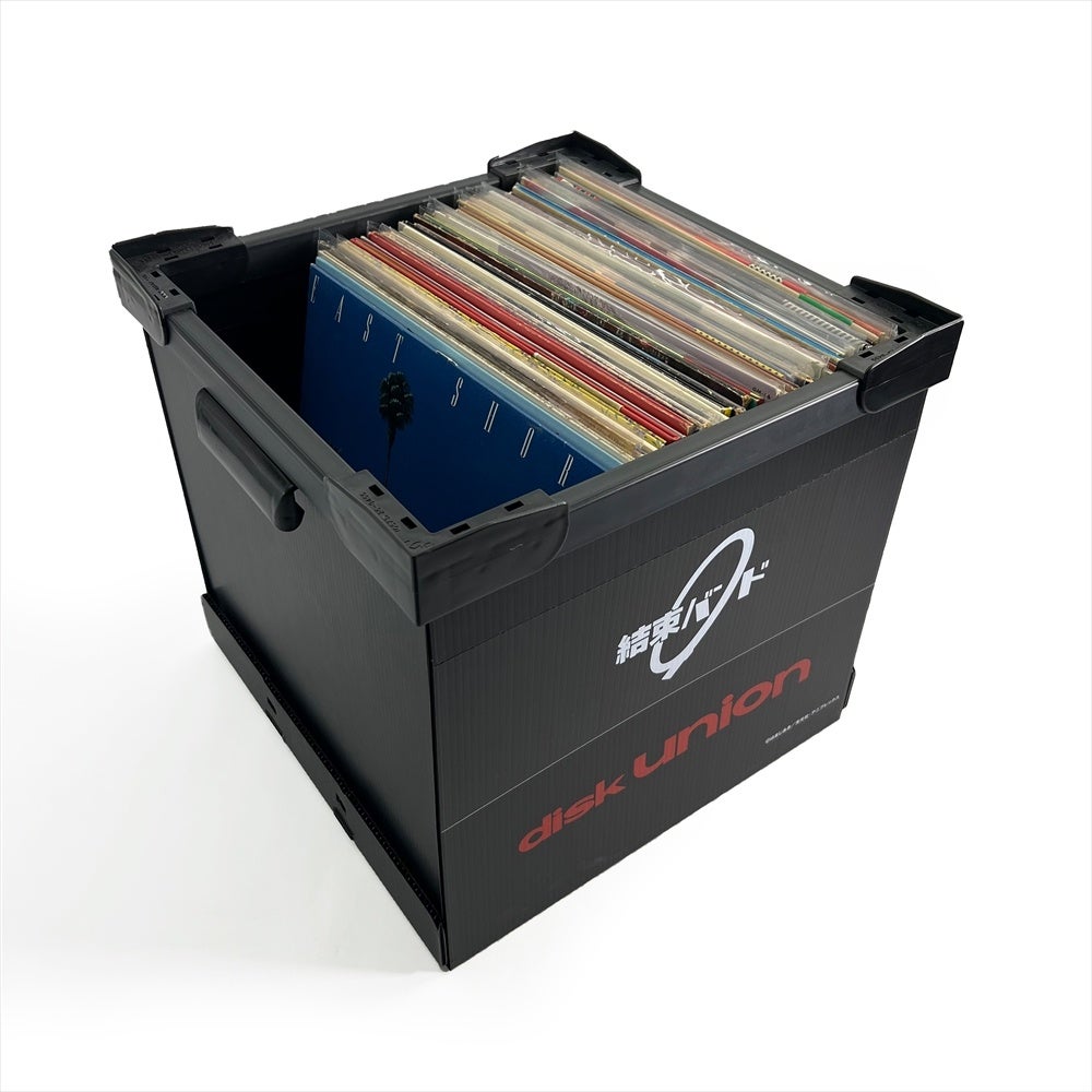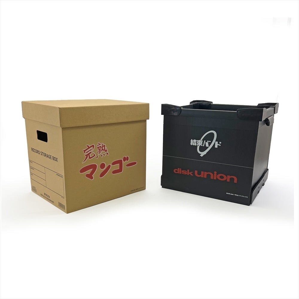 LPレコード用のクラフト地の蓋つきストレージボックスに完熟マンゴーの文字をプリントしたものと、LP用コンテナに結束バンドとdiskunionロゴがプリントされたデザインです