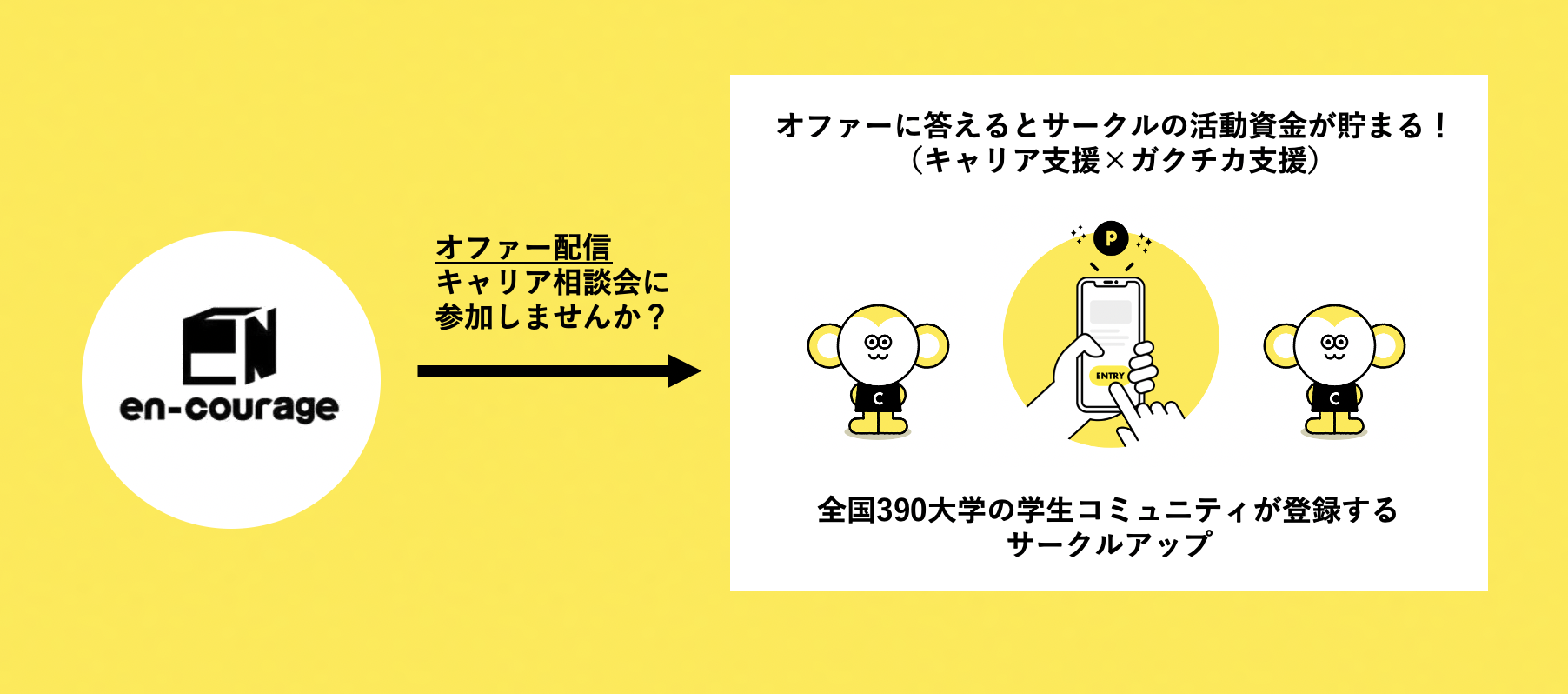 サークルアップでは学生がオファーに応えることで、所属するコミュニティの活動資金などに換えられる「サークルポイント」がもらえるため、エンカレッジはキャリア支援と課外活動(通称:ガクチカ)の支援を同時に行うことが可能になります。