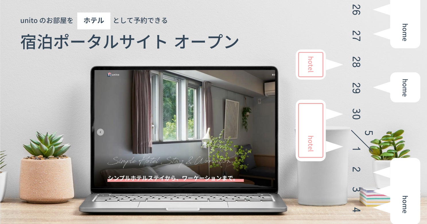 住んだ分だけの家賃で暮らせる部屋「unito」、入居者が帰らない日のお部屋を予約できる宿泊ポータルをオープン