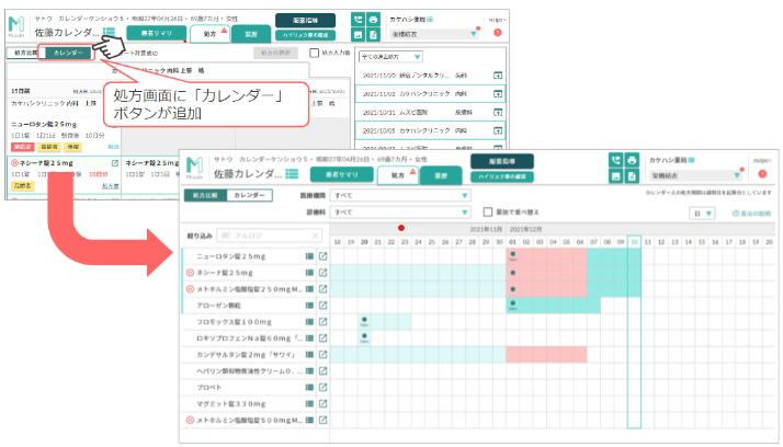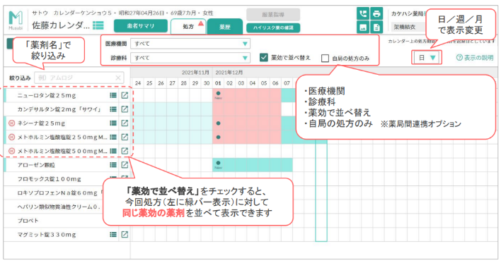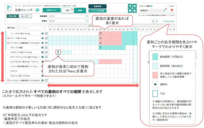 特徴① 各薬剤の処方期間や薬効の重複をカレンダー形式で確認できる